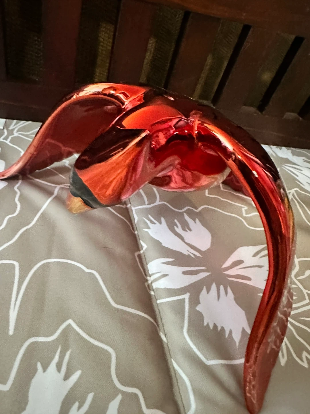 A shiny red cardinal bird figurine with metallic accents. Its vibrant colour and reflective surface make it a striking decorative piece. This decorative bird adds a touch of natural beauty to any space.
