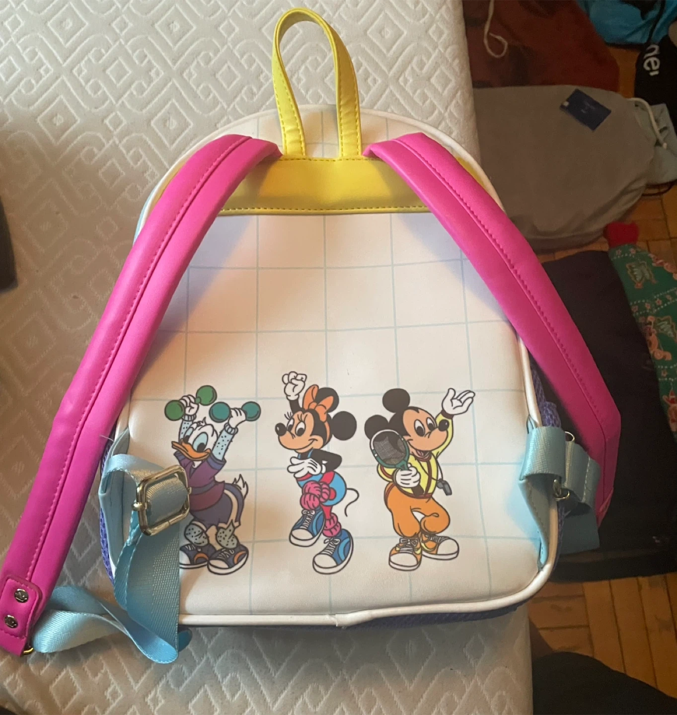 This is a cute Loungefly Disney Mousercise backpack featuring Mickey Mouse, Donald Duck, and Daisy Duck. It has adjustable shoulder straps and a zip closure