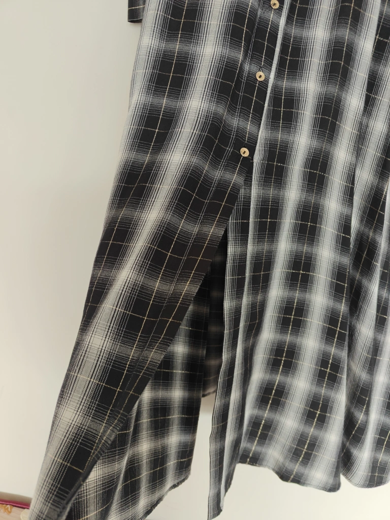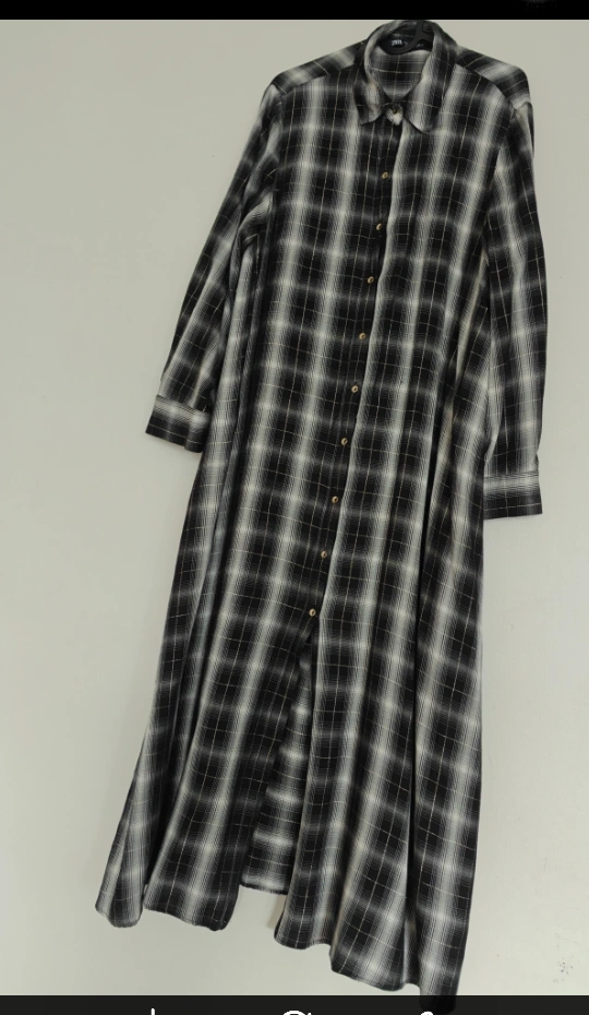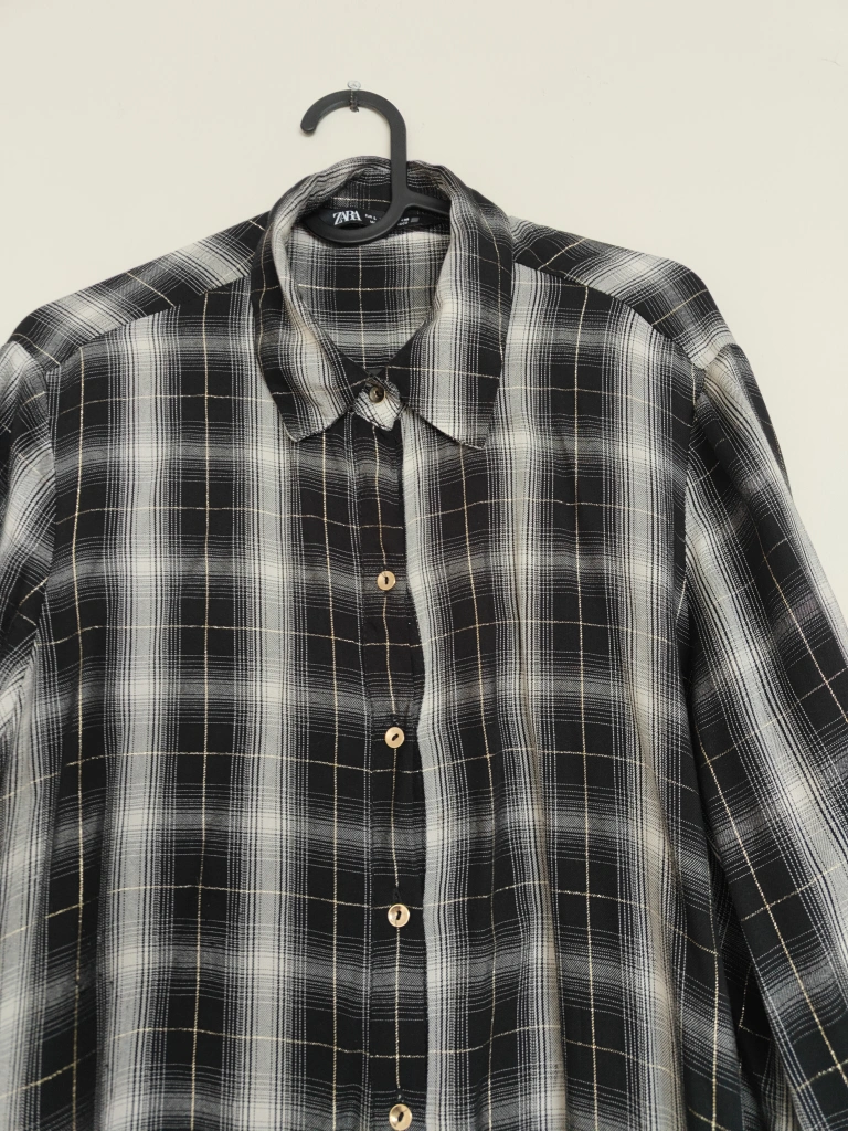 Selling a Zara plaid maxi shirt dress! It features a black and white plaid pattern with gold accents. Perfect for a casual or dressed-up look