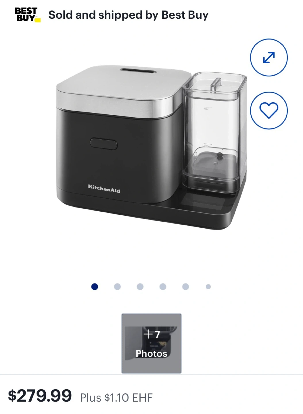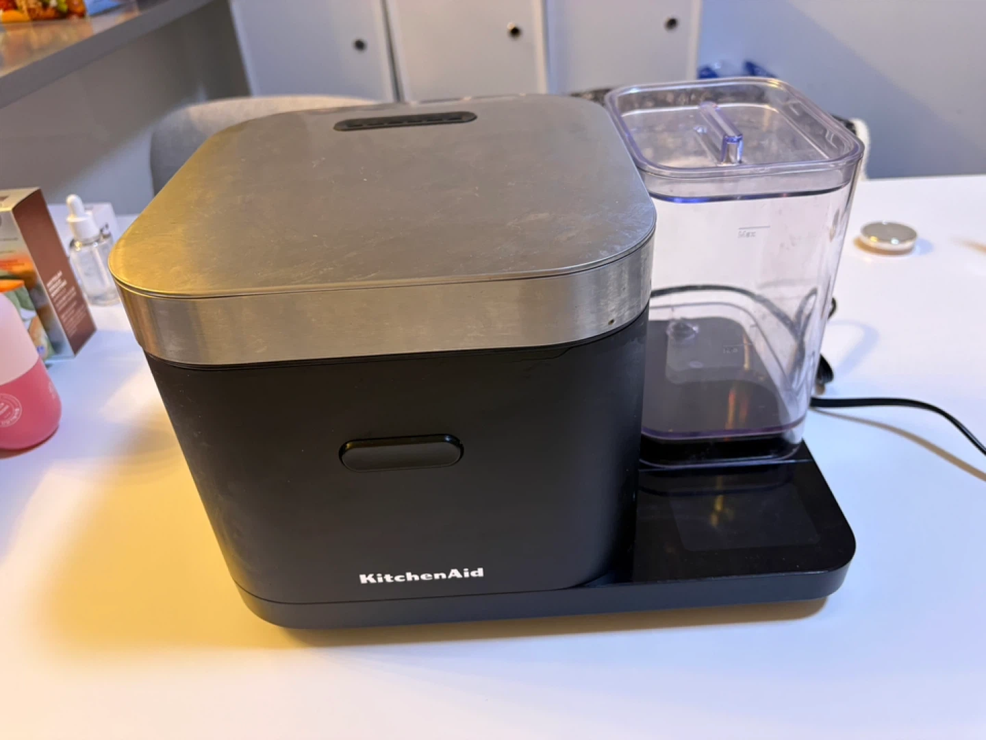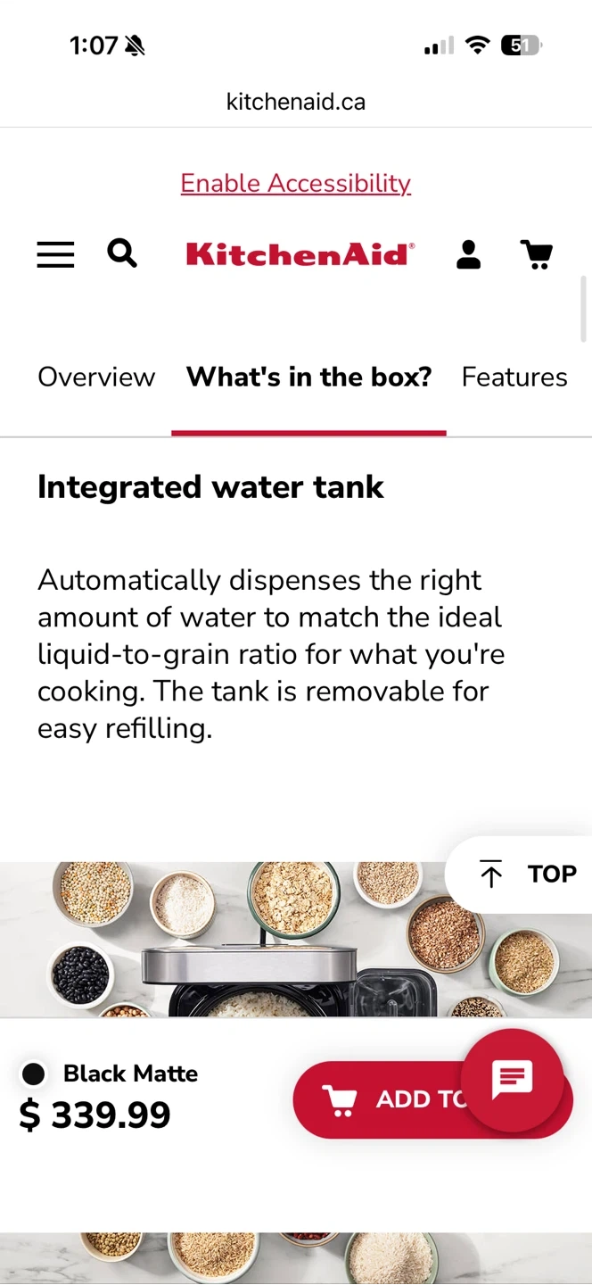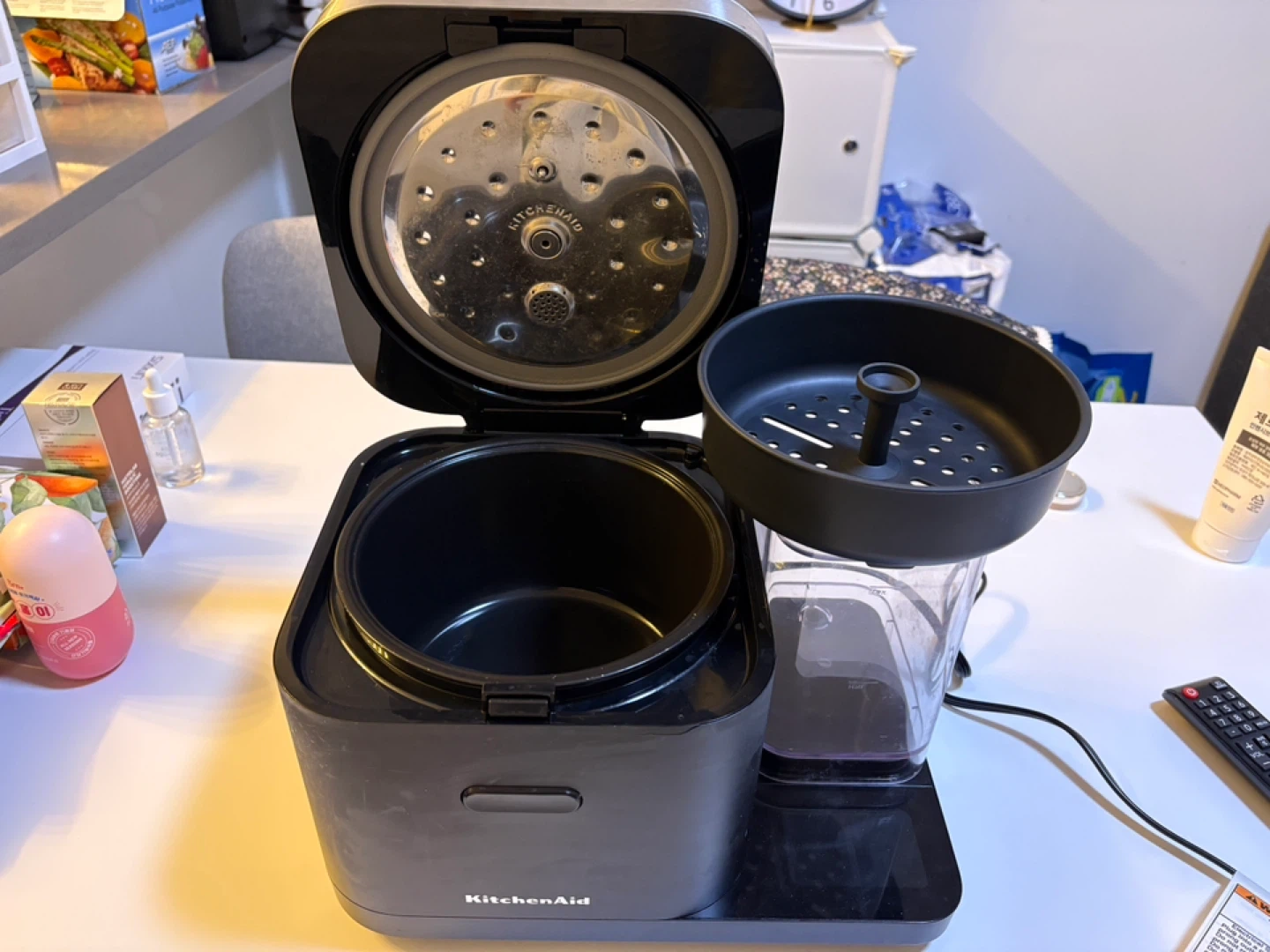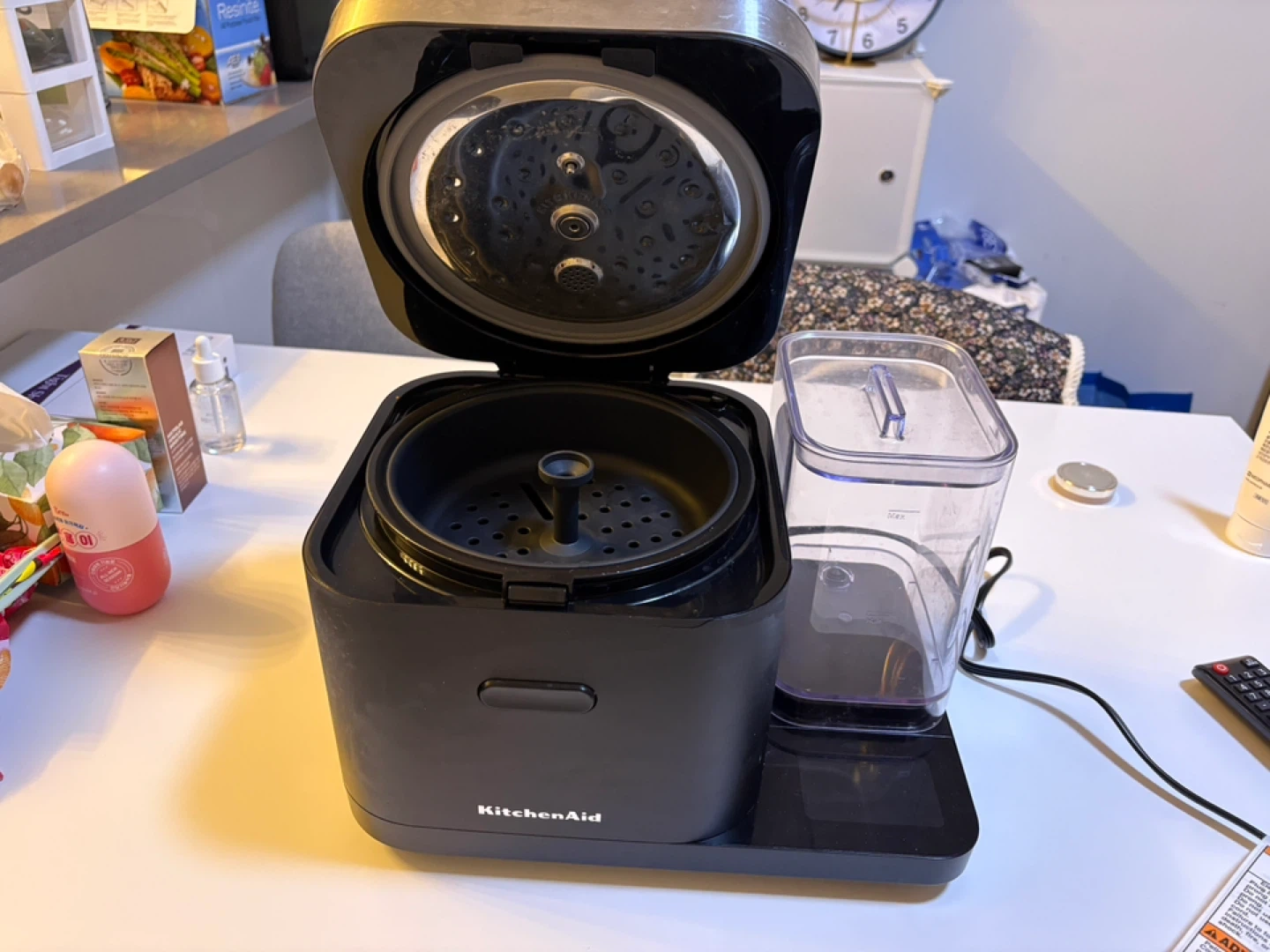 This KitchenAid rice cooker is black with a removable water tank. It automatically dispenses the right amount of water to match the ideal liquid-to-grain ratio for cooking. The tank is removable for easy refilling.
