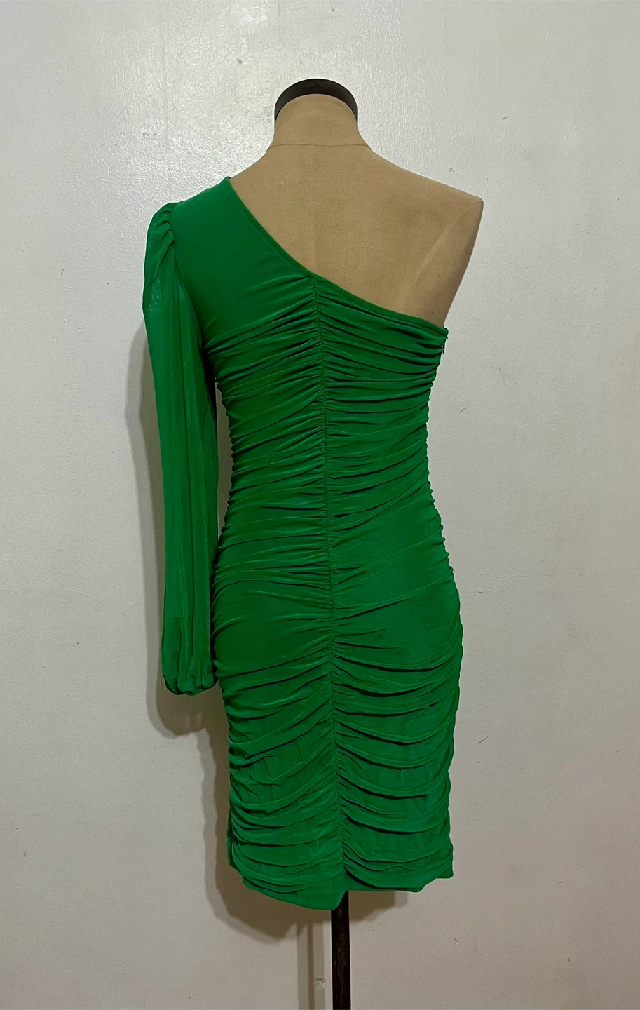 A vibrant green one-shoulder dress with ruched detailing. This dress features a full-length sheer, puff sleeve on one side and a bodycon fit. It's made from a stretchy polyester blend. Great for a night out and perfect for spring/summer.
