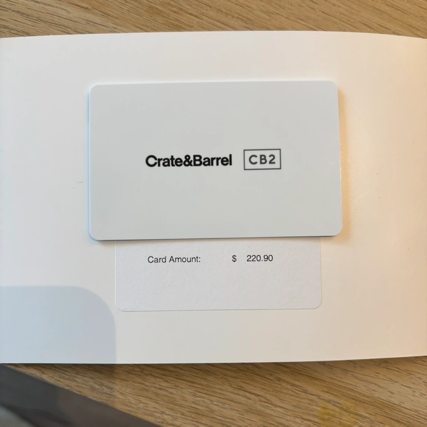 This is a Crate & Barrel and CB2 gift card with a balance of $220.90. It's great for picking out new furniture or home decor.