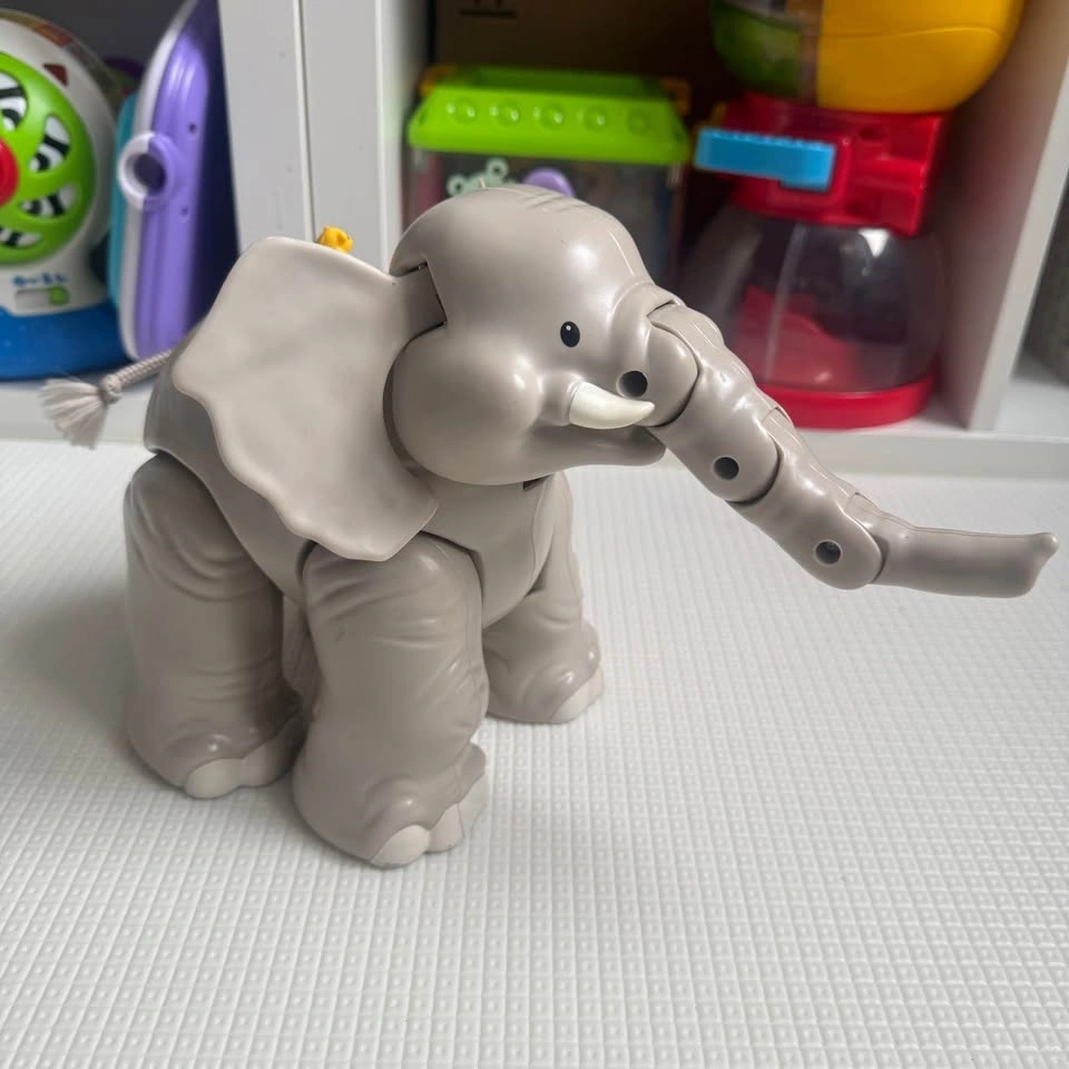Cute gray Little People elephant toy. Has articulated legs and trunk. Little yellow duck is on its back. Has a rope tail. Makes sound. Pick up in Richmond Hill.