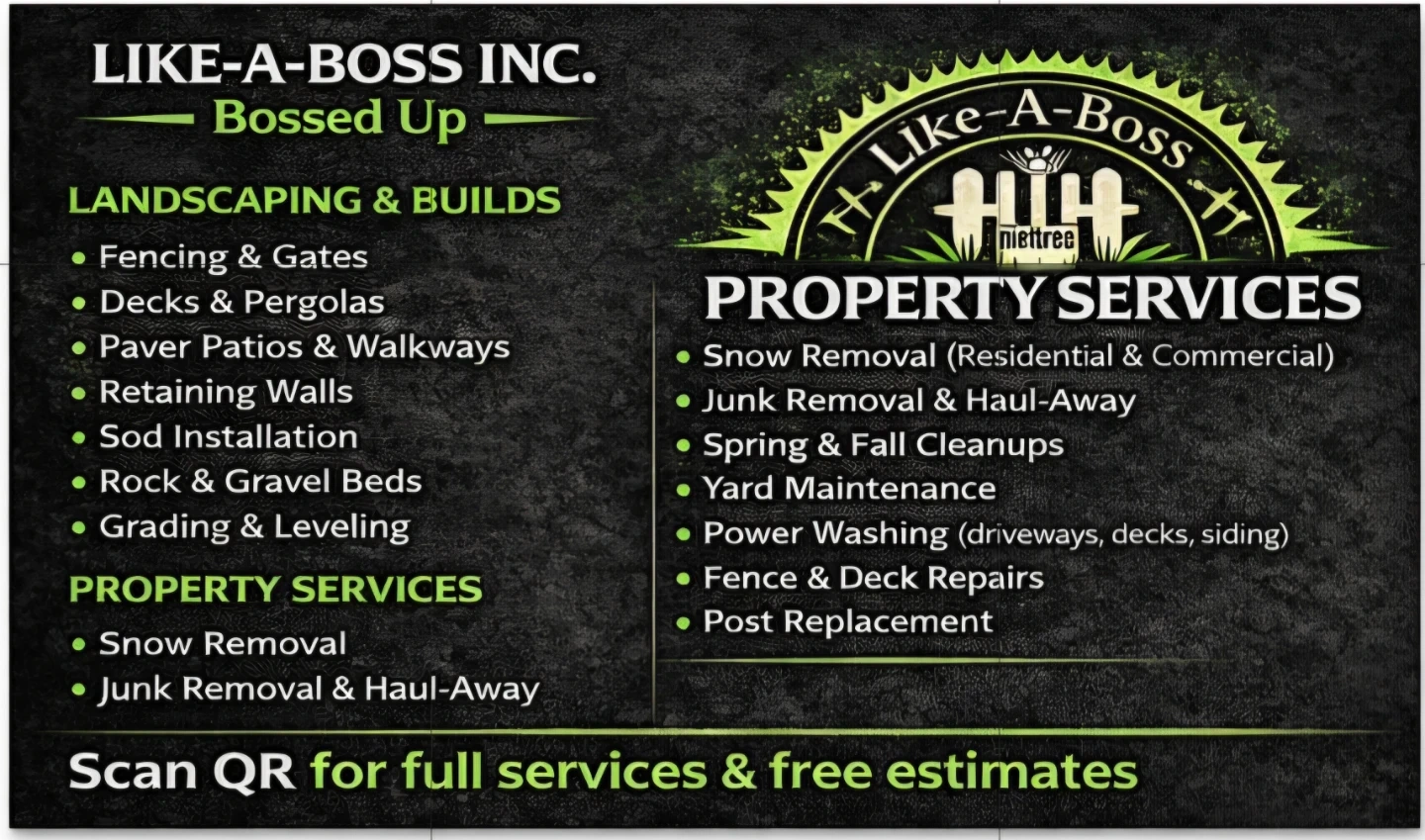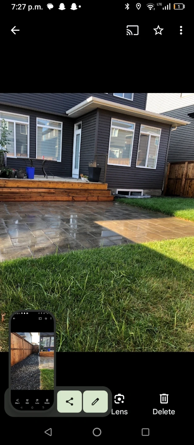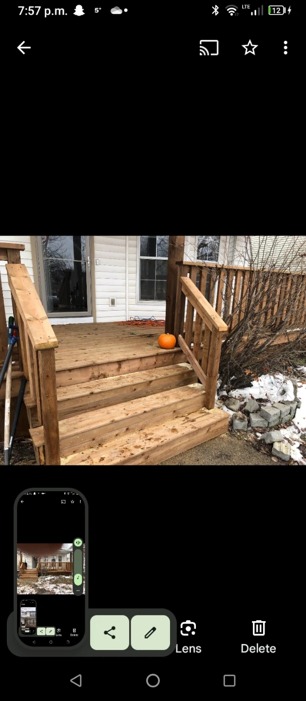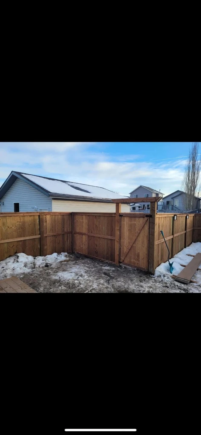 Wooden deck with stairs and railings, and a matching wooden fence with a gate. Made of wood and stained a warm brown colour. Plenty of space for outdoor entertaining or a backyard retreat. This would be great for a new homeowner or someone looking to improve their curb appeal!