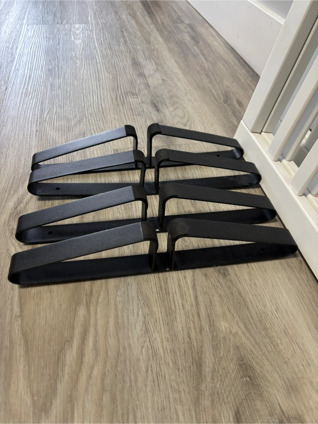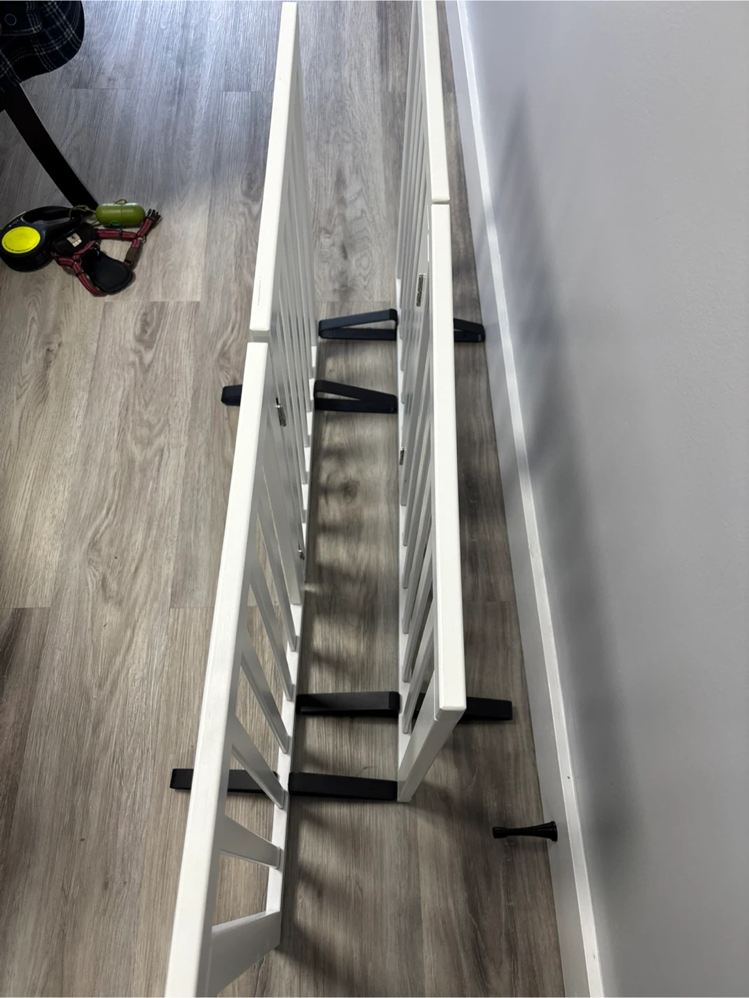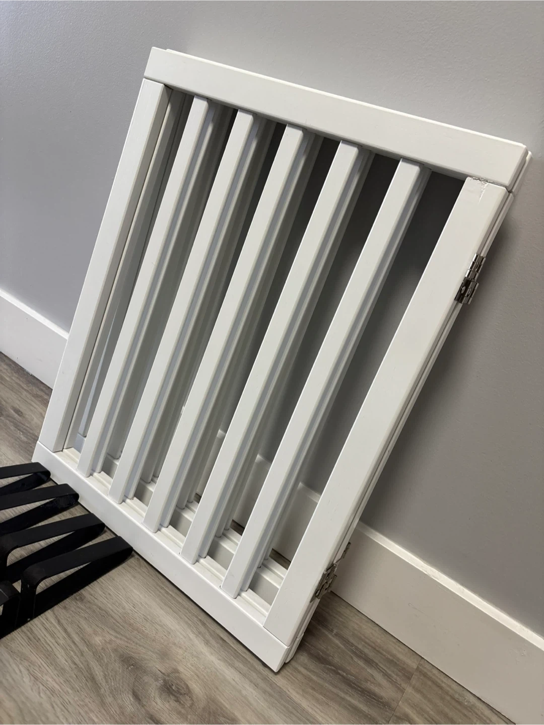 This white wooden baby gate is perfect for keeping little ones safe. It includes multiple metal brackets for secure installation. Easy to set up and adjust for different openings.