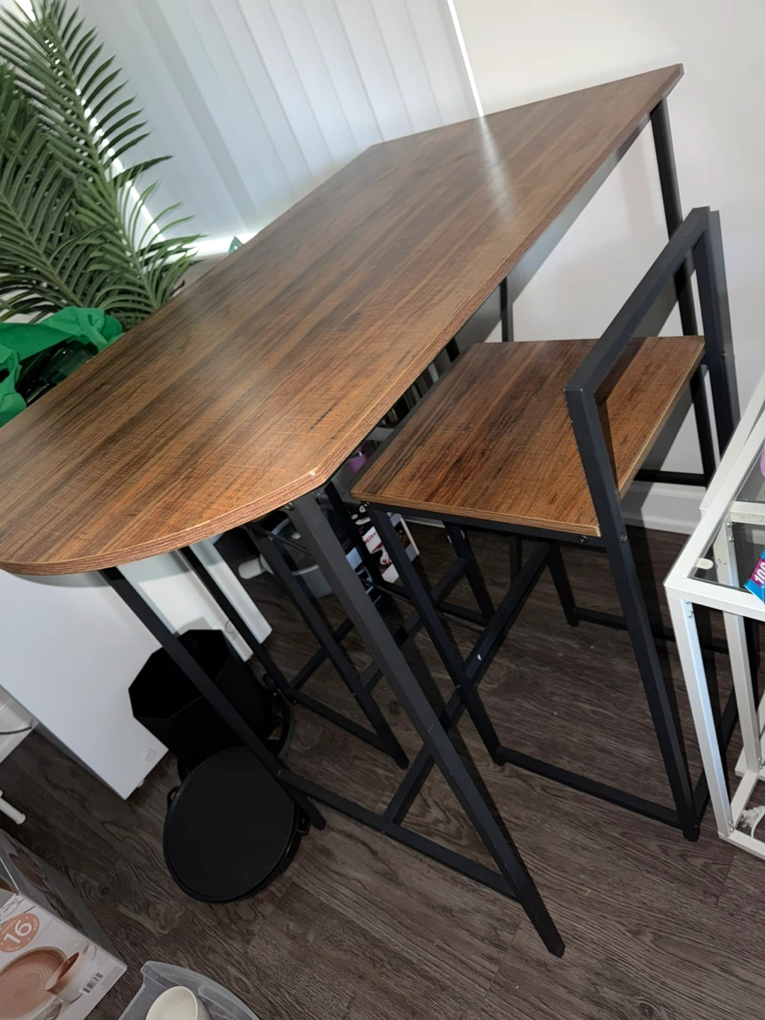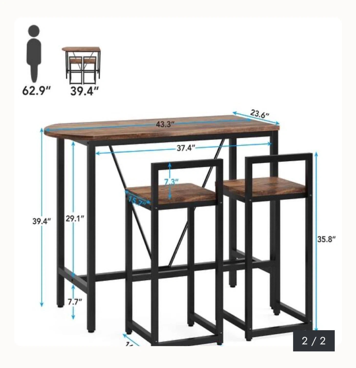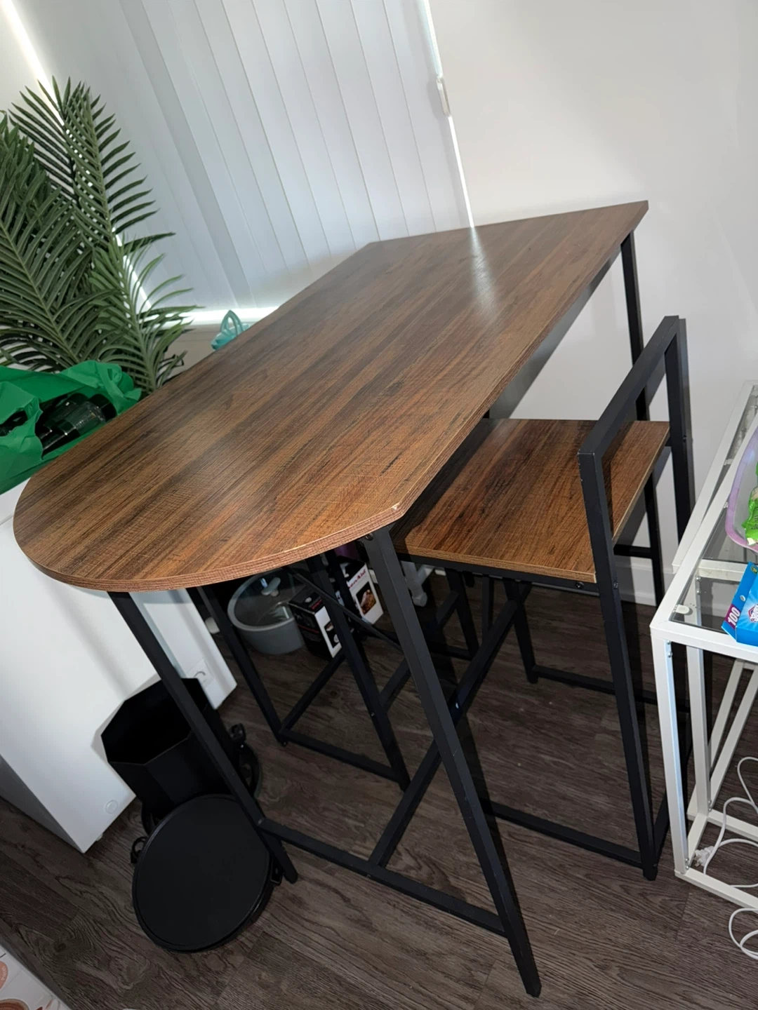 This compact dining set features a lovely wood-grain tabletop and a sturdy black metal frame. It's perfect for smaller spaces, offering a functional dining or workspace. The set includes one table and two matching stools.