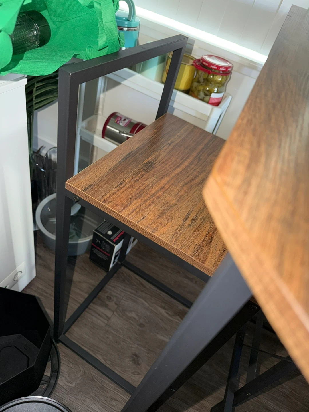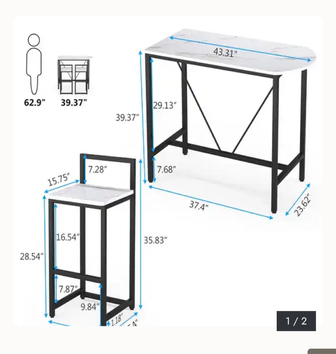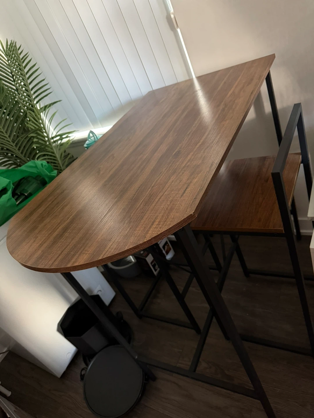 This compact dining set features a lovely wood-grain tabletop and a sturdy black metal frame. It's perfect for smaller spaces, offering a functional dining or workspace. The set includes one table and two matching stools.