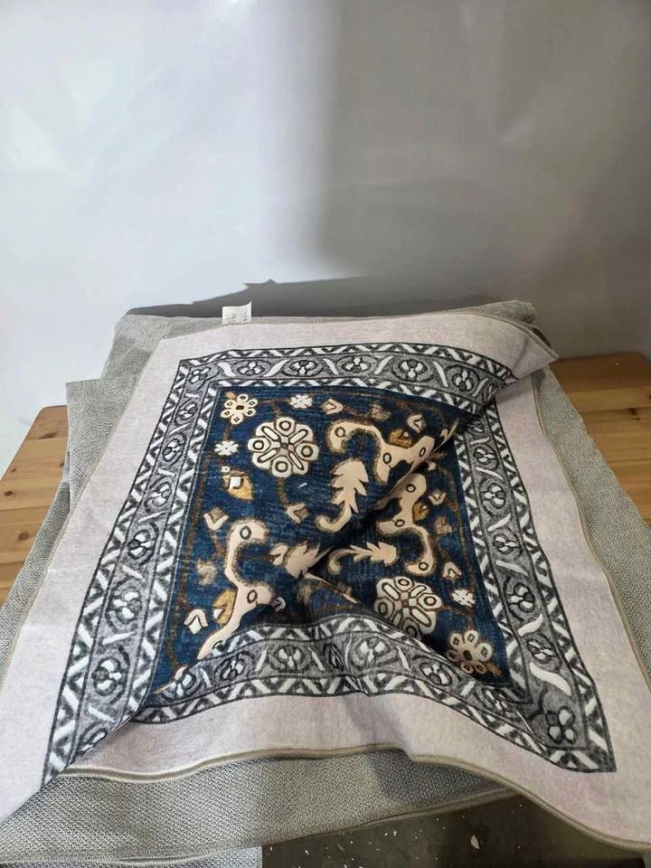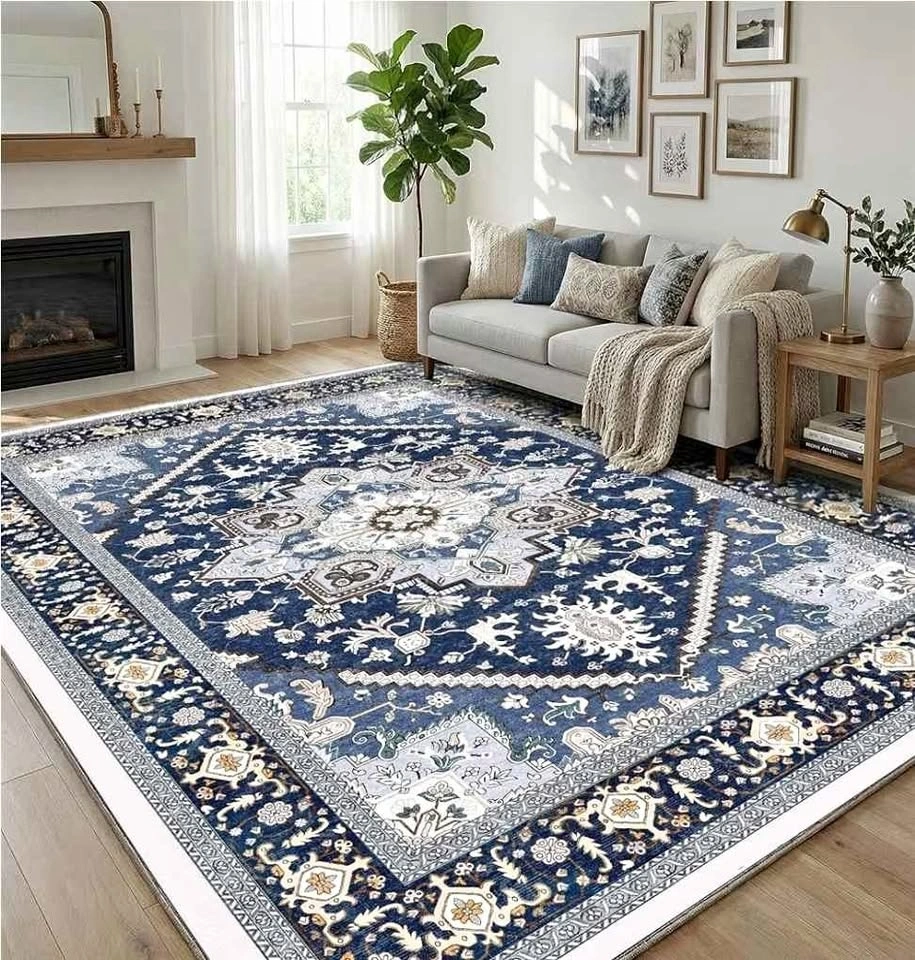 Brand new. Soft low-pile rug adds comfort to any room. Washable design for easy cleaning and maintenance. Non-slip backing keeps the rug in place. Perfect for living rooms, bedrooms, or home offices. Stylish navy blue and golden colors enhance décor.