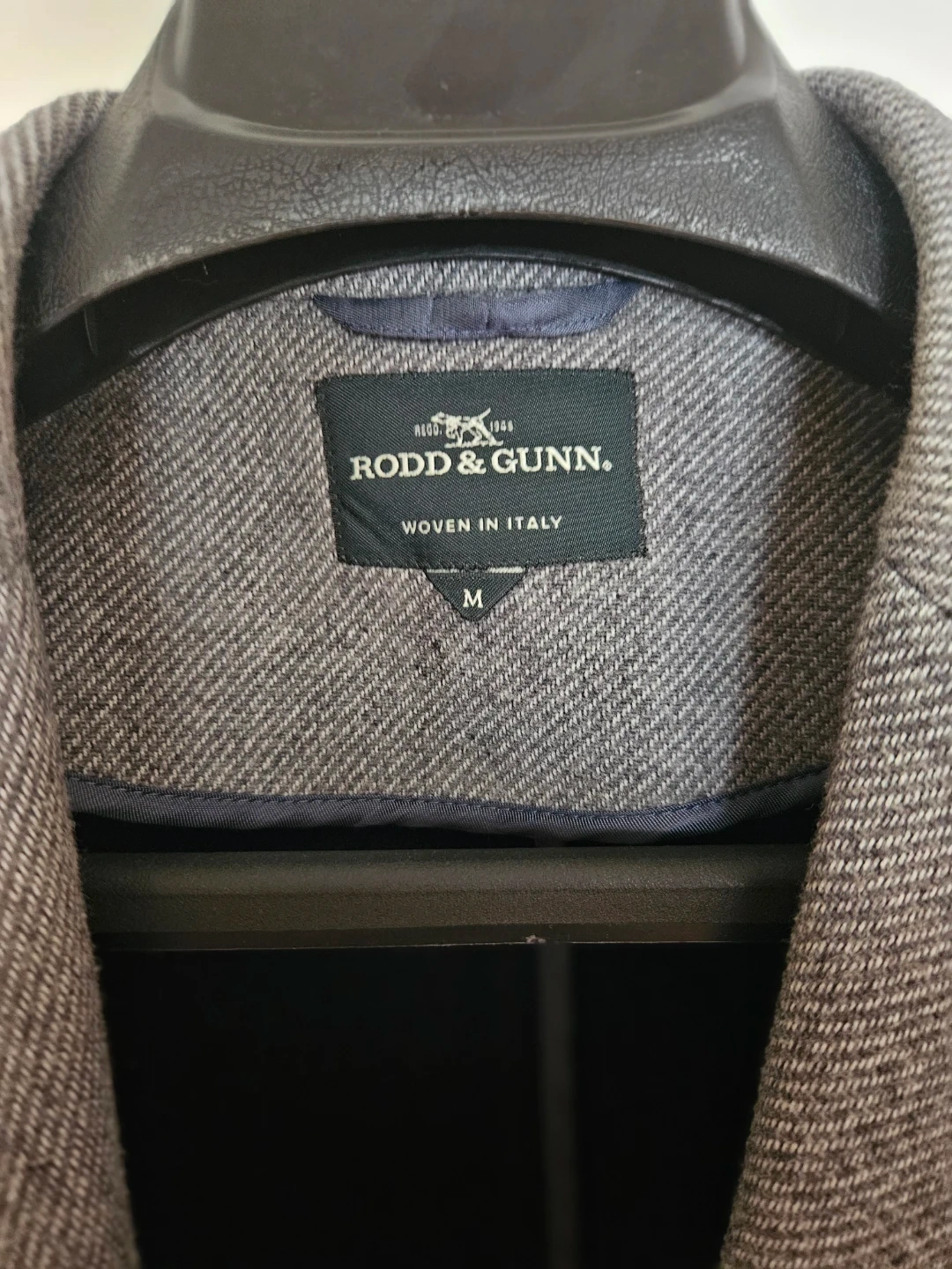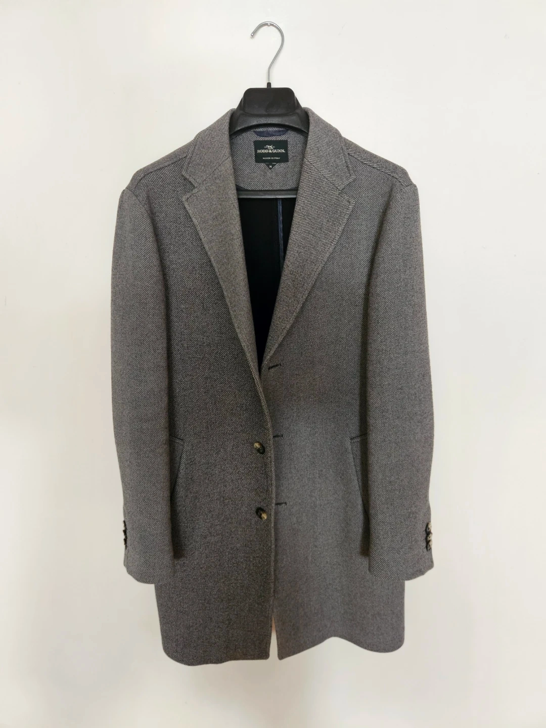 This Rodd & Gunn topcoat comes in a classic grey herringbone pattern. It's made with a wool blend and woven in Italy. Perfect for staying warm and stylish during colder months!