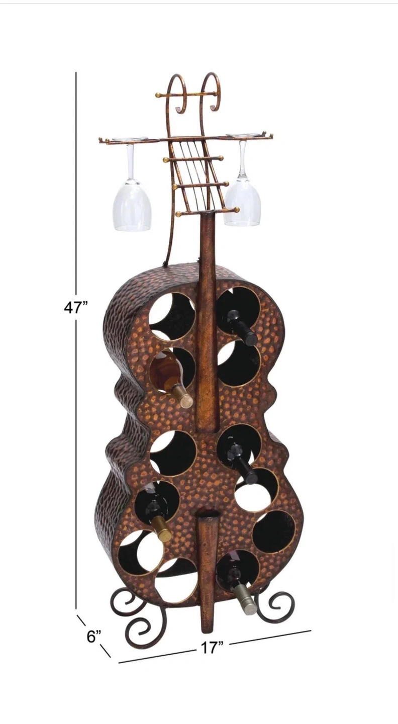 This unique Cello shaped wine rack can hold up to 12 bottles of wine. It's made of metal with a distressed brass finish. Includes a rack for hanging wine glasses. The maximum weight limit is 100 lbs. Overall product weight is 8.8lbs