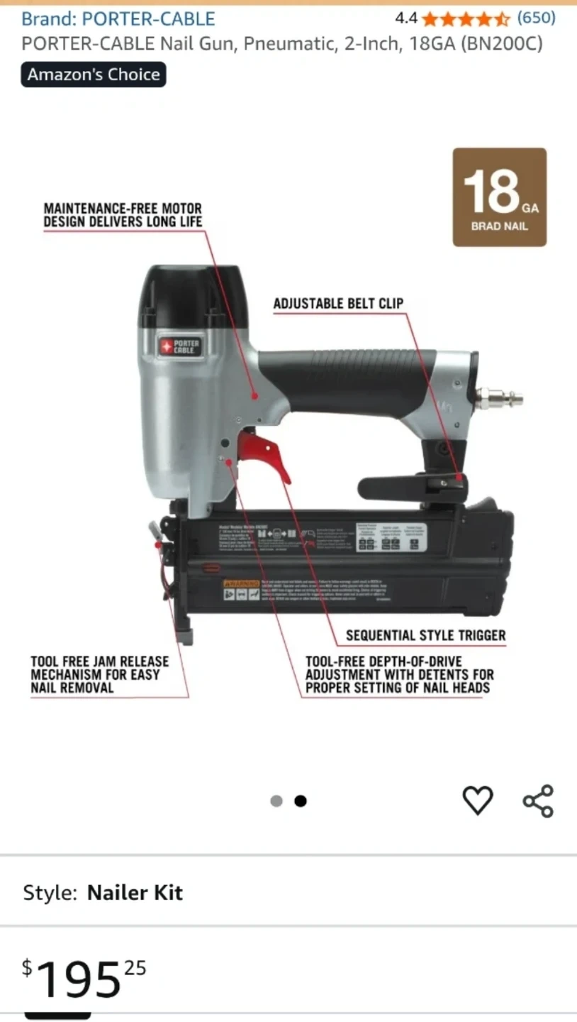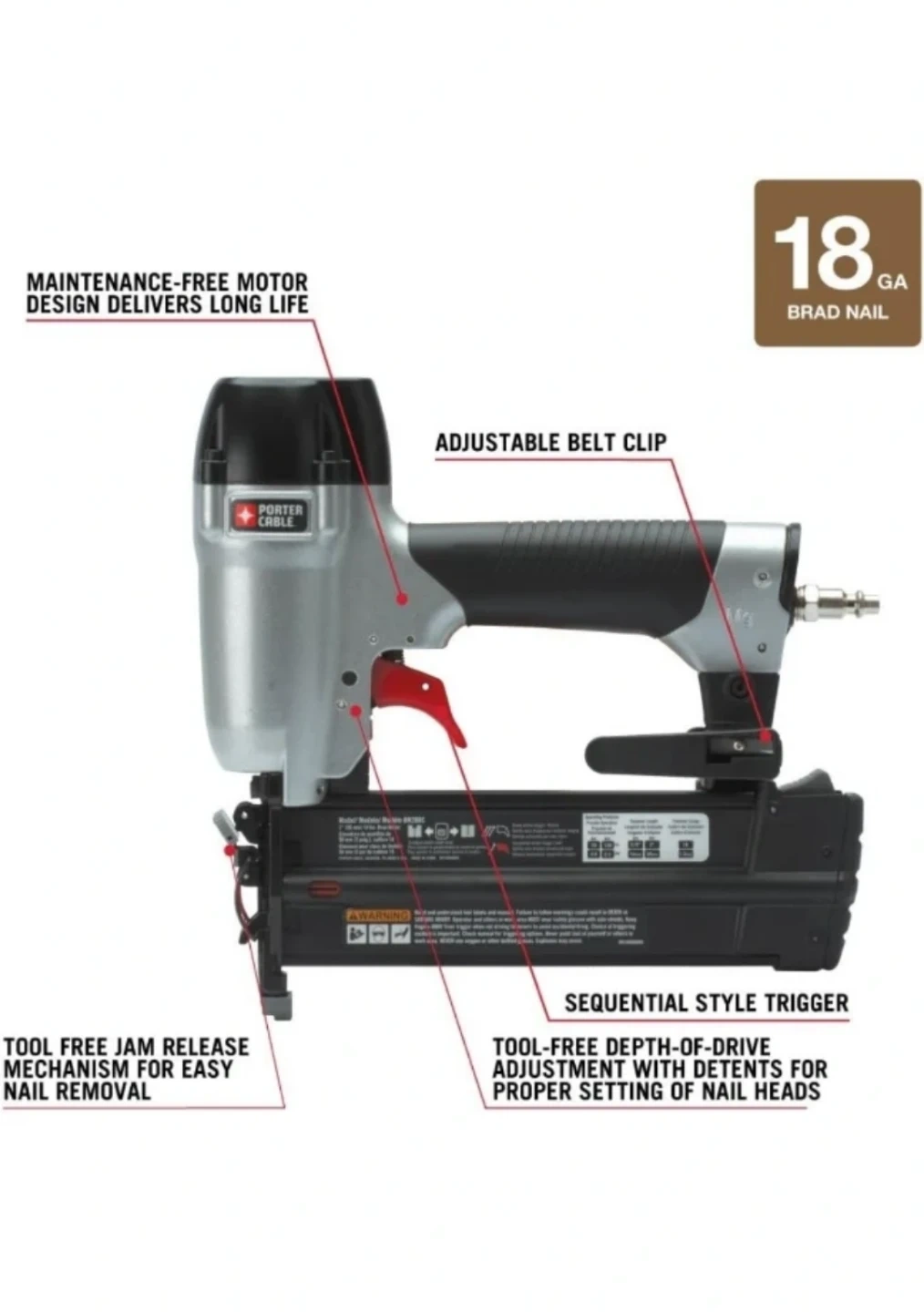 This is a Porter-Cable pneumatic 18 gauge brad nailer. It features a maintenance-free motor and tool-free jam release. It also has a sequential style trigger and adjustable depth of drive