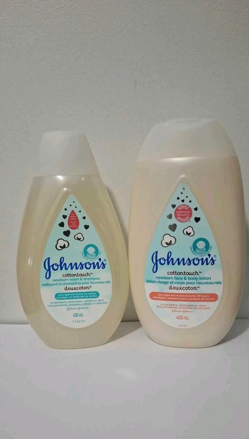 Johnson's Cotton Touch newborn wash & shampoo and face & body lotion set. Each bottle is 400 mL. The wash & shampoo leaves no residue. The lotion moisturizes for 24 hours. Both are free from parabens, phthalates, sulfates or dyes.