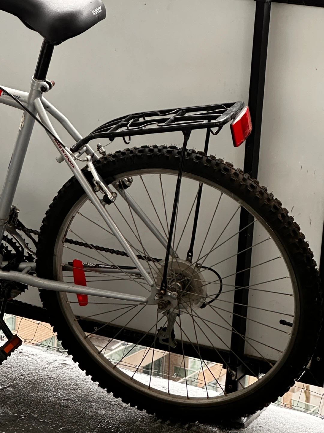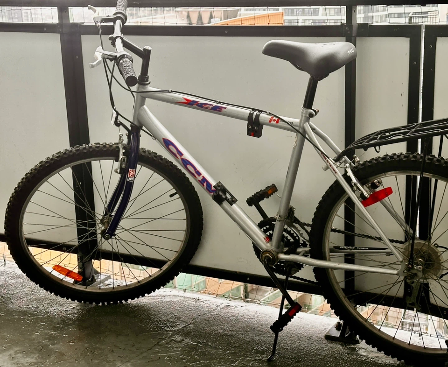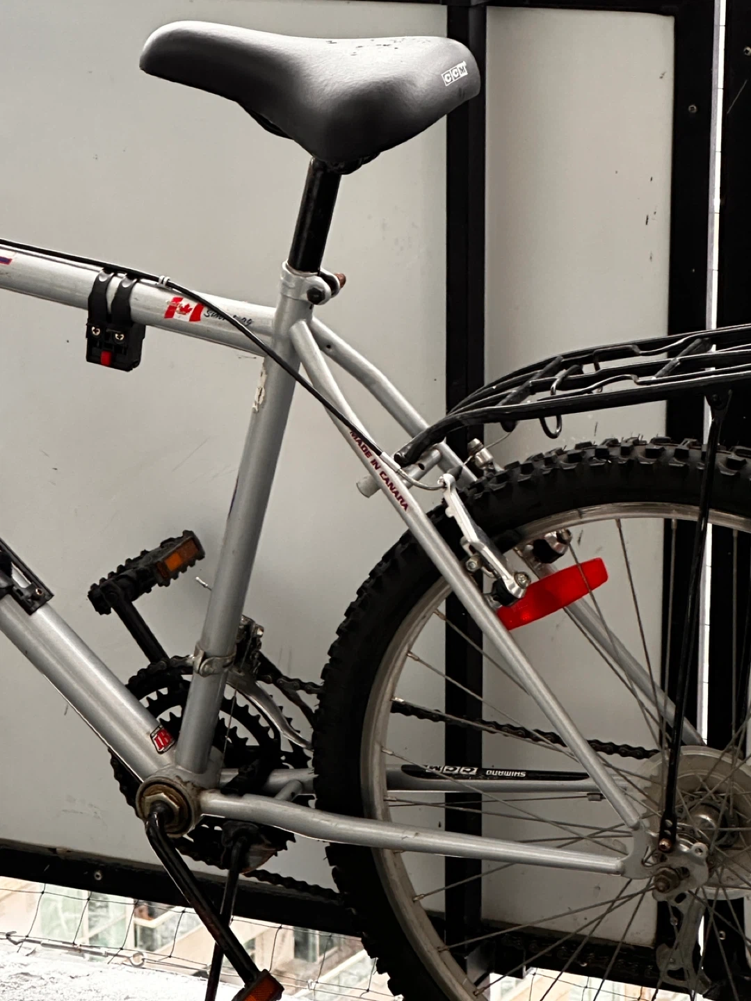 CCM mountain bike with a silver frame. It has a rear rack and reflectors for added visibility. This bike is ready for your next trail adventure!
