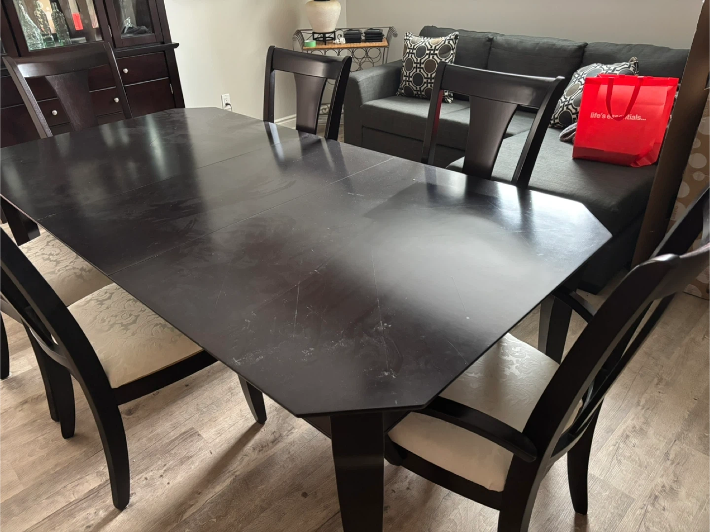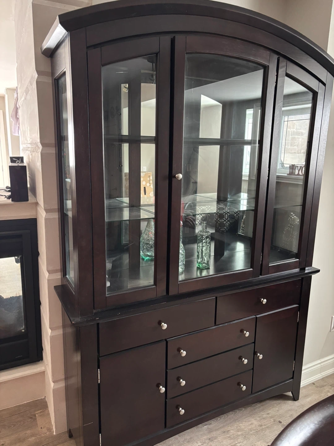 A dark brown china cabinet with glass doors and drawers. It's paired with a matching dining table and chairs featuring upholstered seats. This set offers ample storage and seating for your dining room.