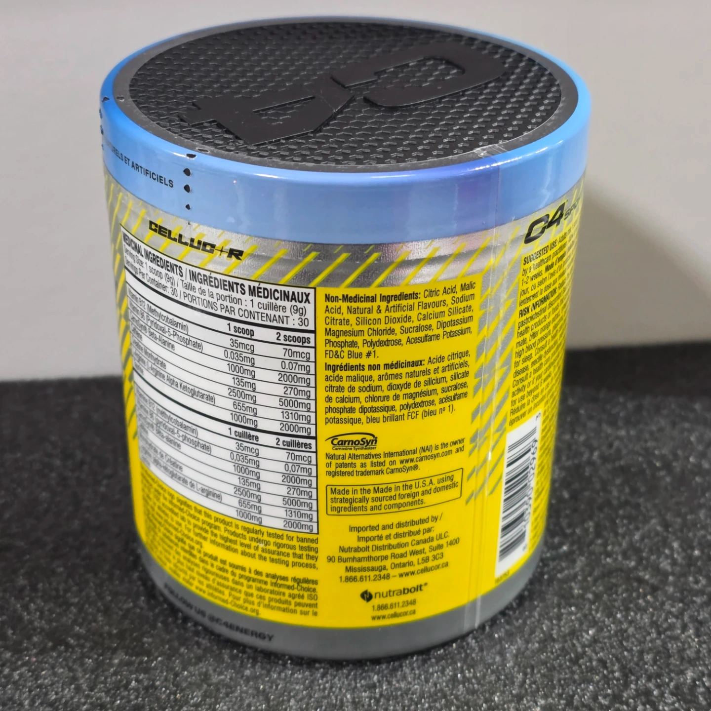 This is a C4 Sport pre-workout supplement in Blue Raspberry flavour. It's a 270g container. This supplement is designed to help elevate energy and performance during workouts.