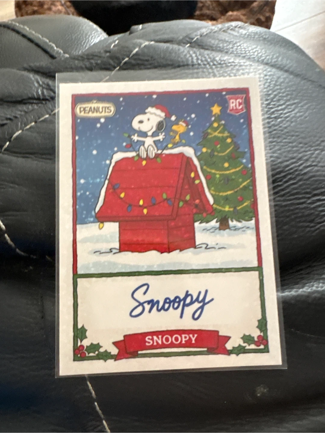 This is a Peanuts card featuring Snoopy with his doghouse and a Christmas tree. It has a festive holiday design. This card is perfect for any Snoopy fan during the holiday season
