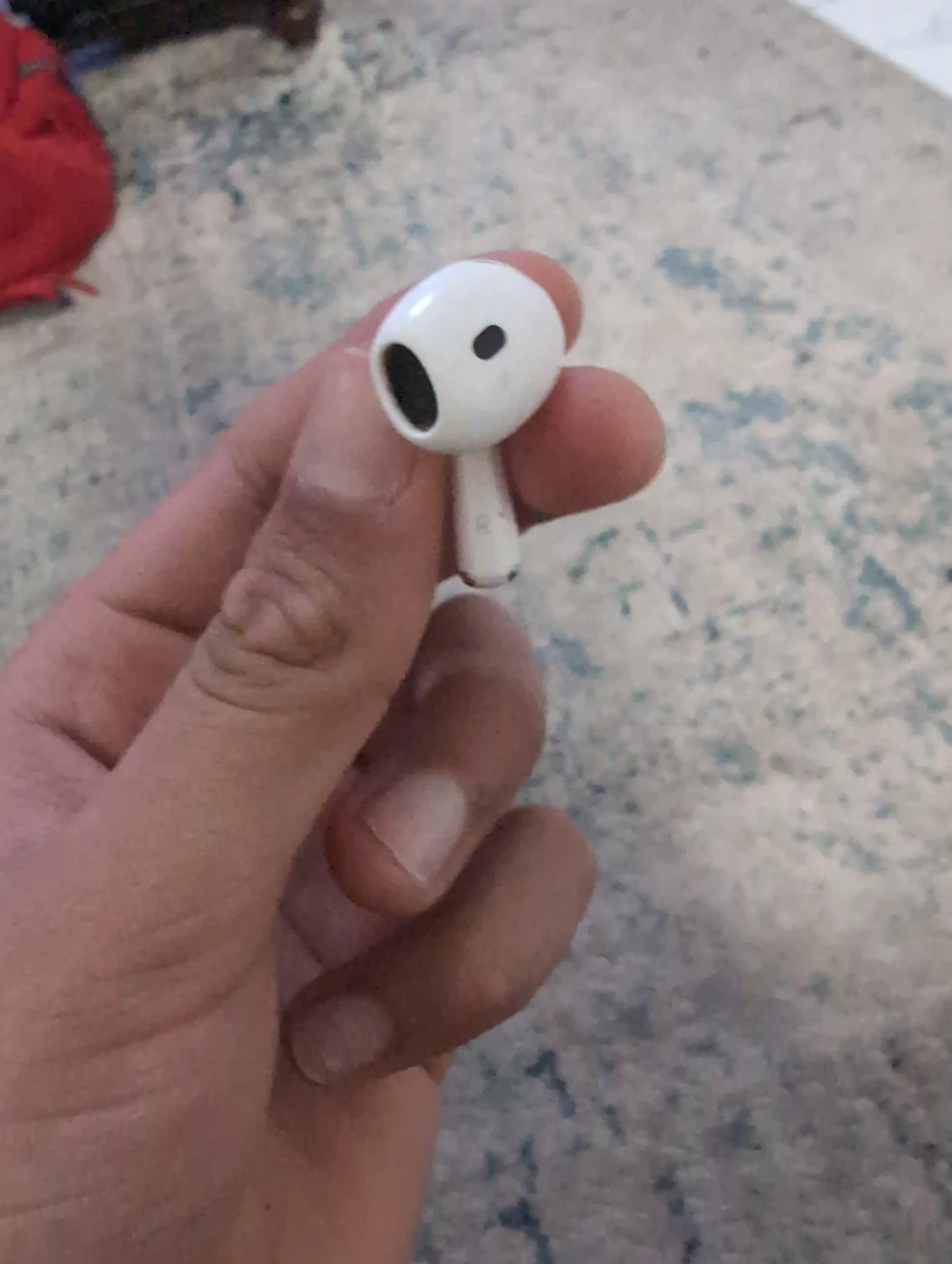 Single white Apple AirPods Pro right earbud. It's a wireless in-ear headphone. The earbud is white plastic.