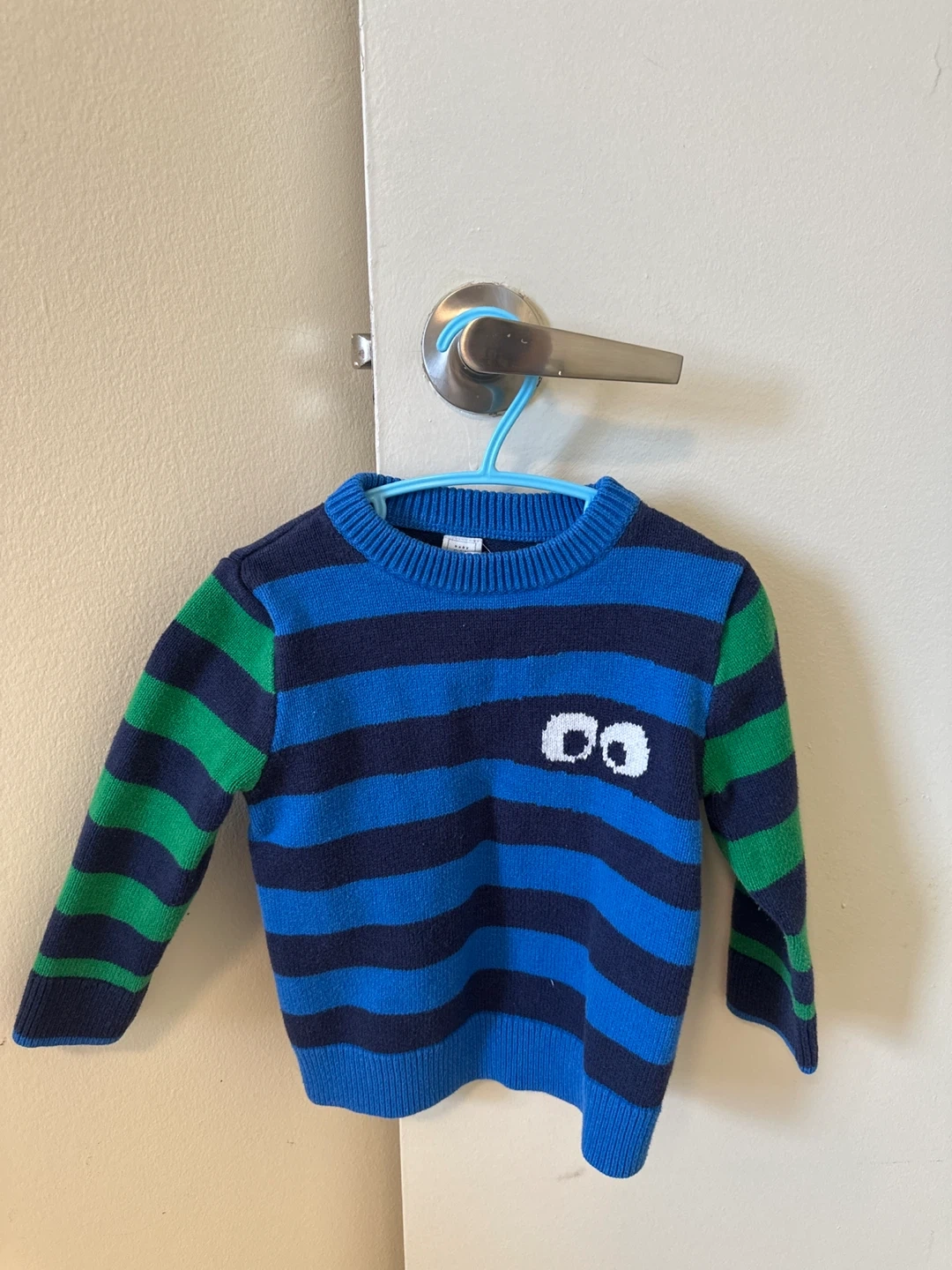 This long-sleeved sweater features blue and navy stripes with a cute monster eye appliqué. It's made from a soft knit material.