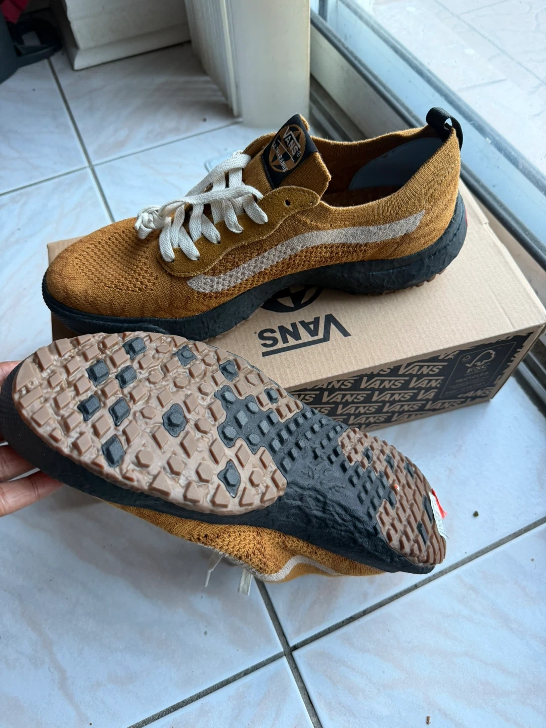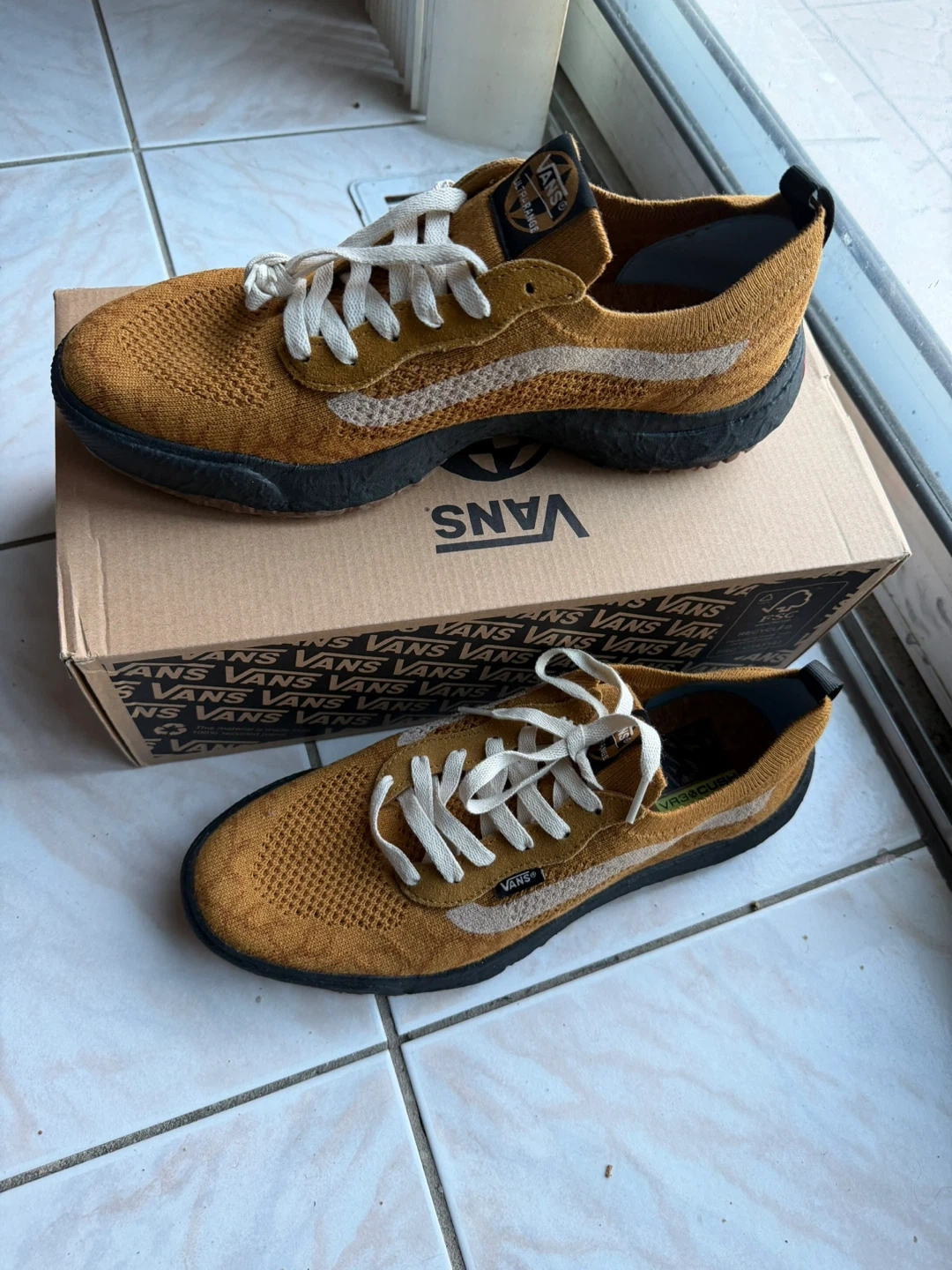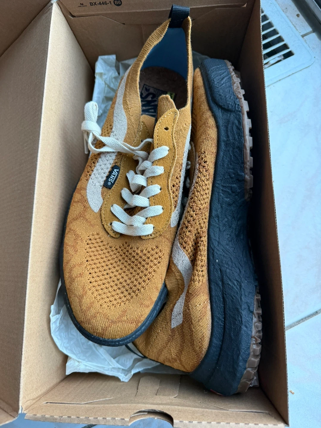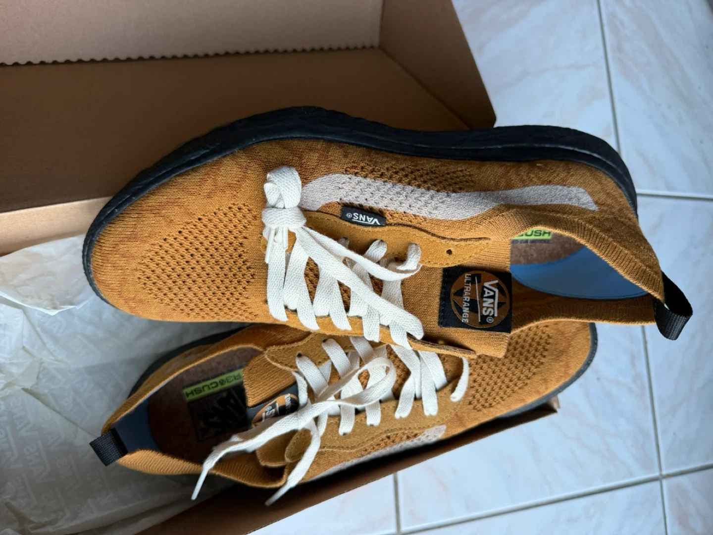 A pair of Vans Ultrarange EXO SE shoes in a mustard yellow knit. These shoes are in their original box. They're designed for comfort and performance.
