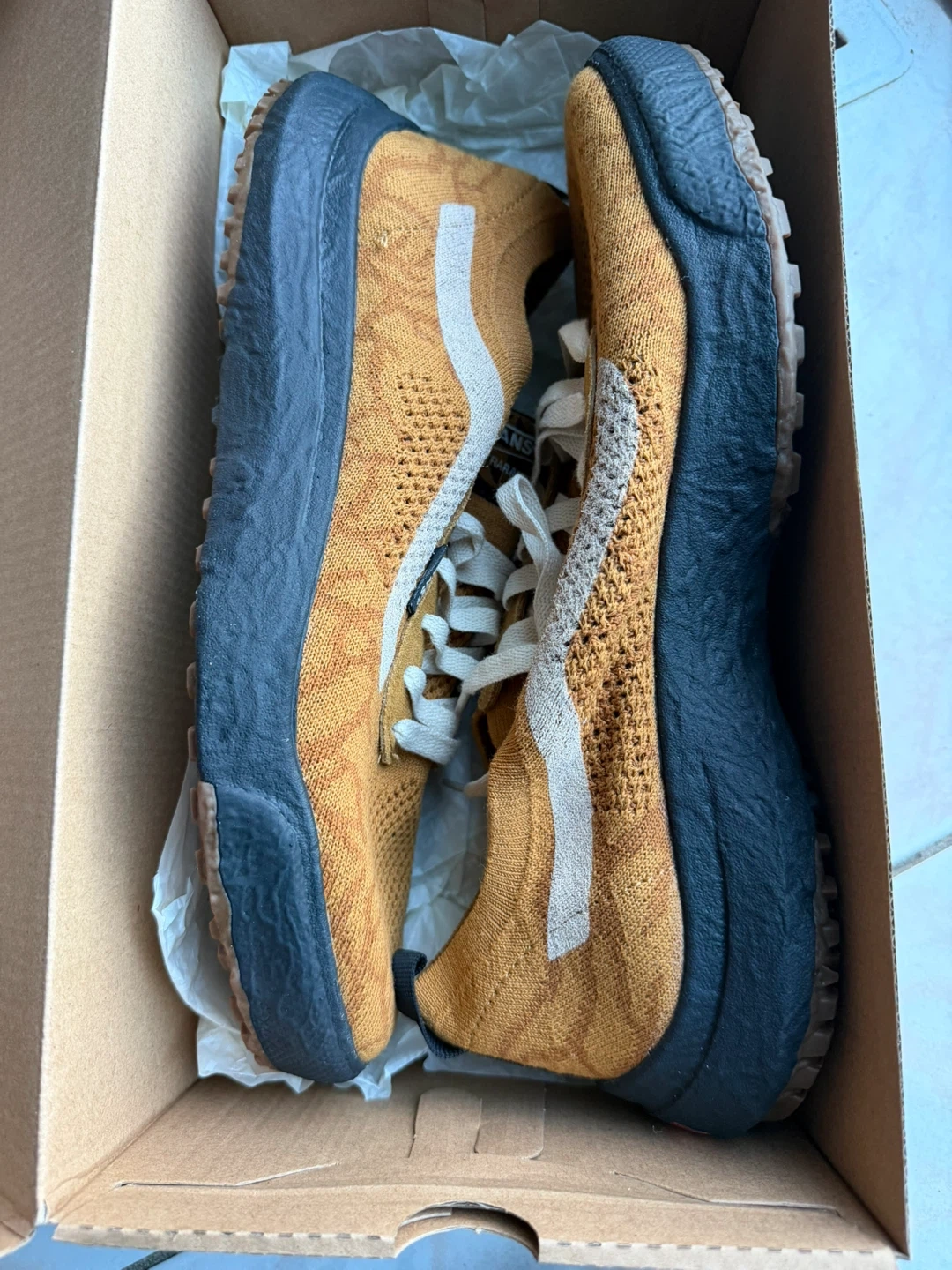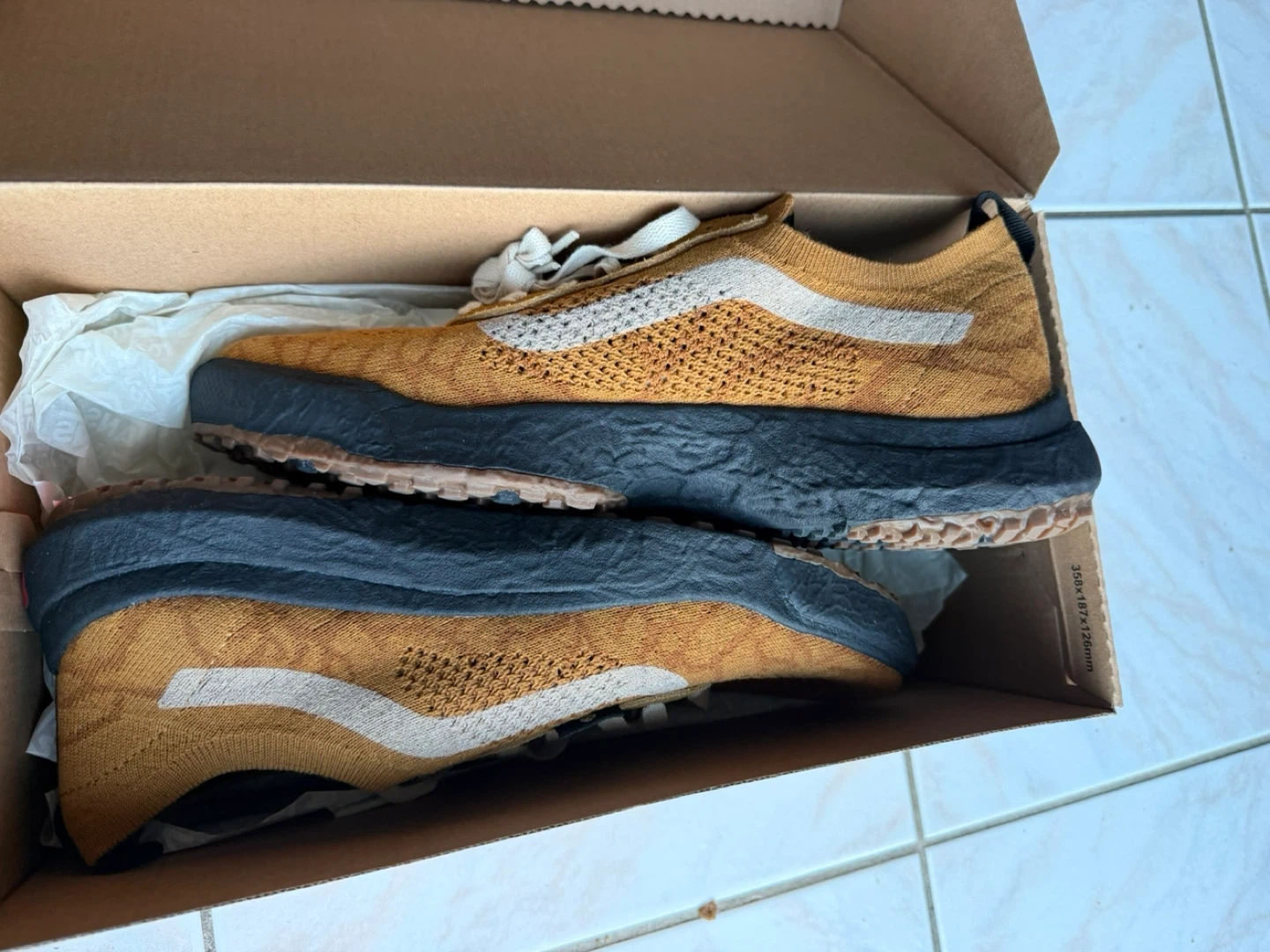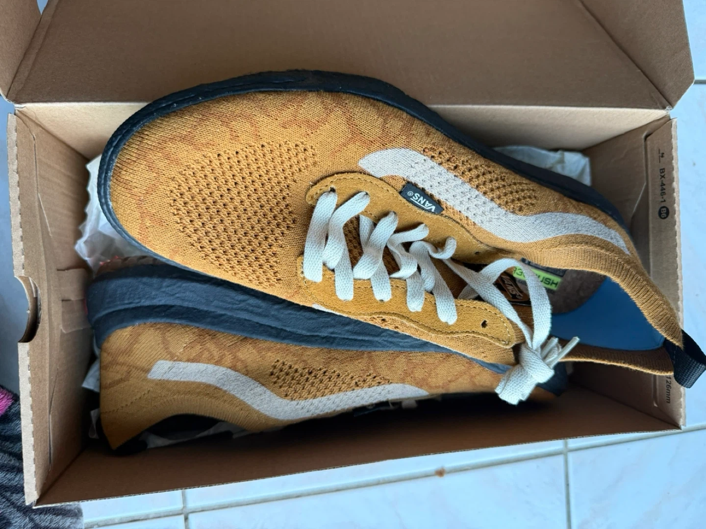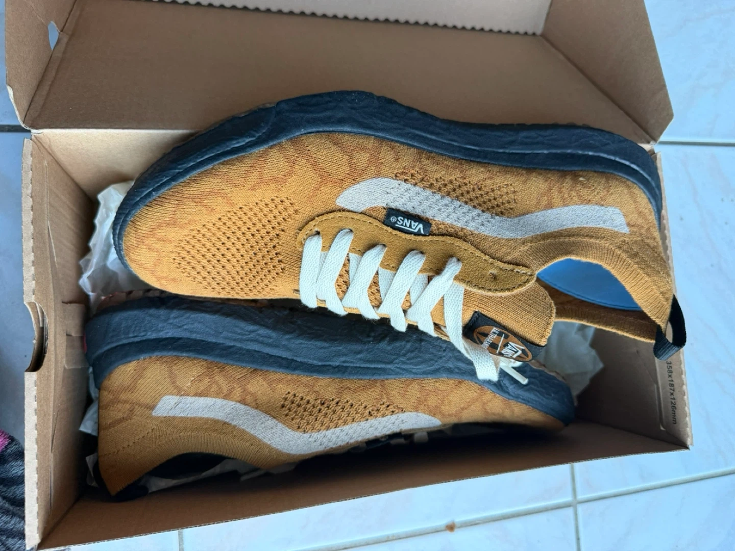 A pair of Vans Ultrarange EXO SE shoes in a mustard yellow knit. These shoes are in their original box. They're designed for comfort and performance.