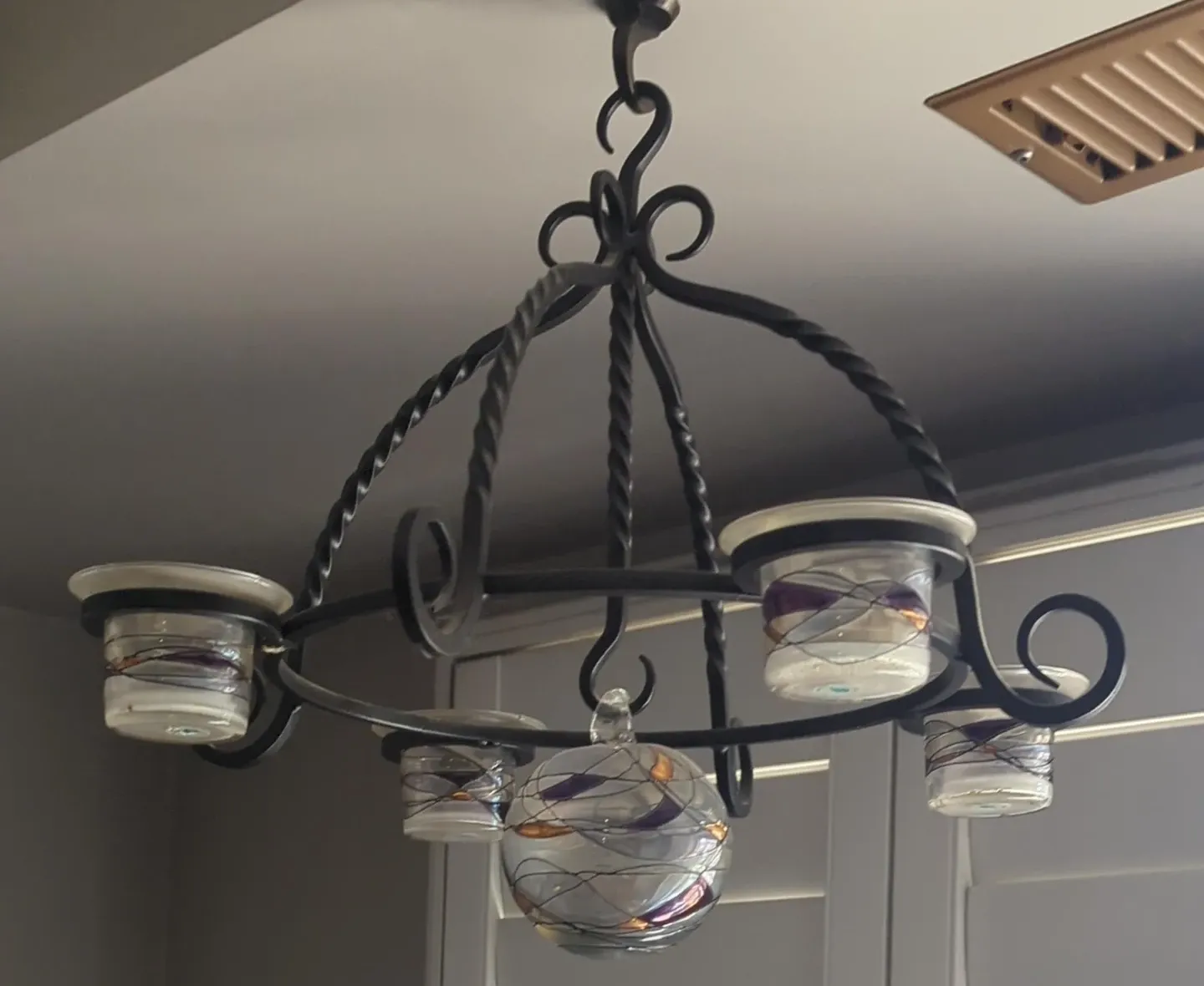 This wrought iron chandelier features five decorative glass candle holders with swirling purple and clear accents. It adds a warm ambiance to any space. It's suitable for use with pillar or votive candles, creating a cozy atmosphere.