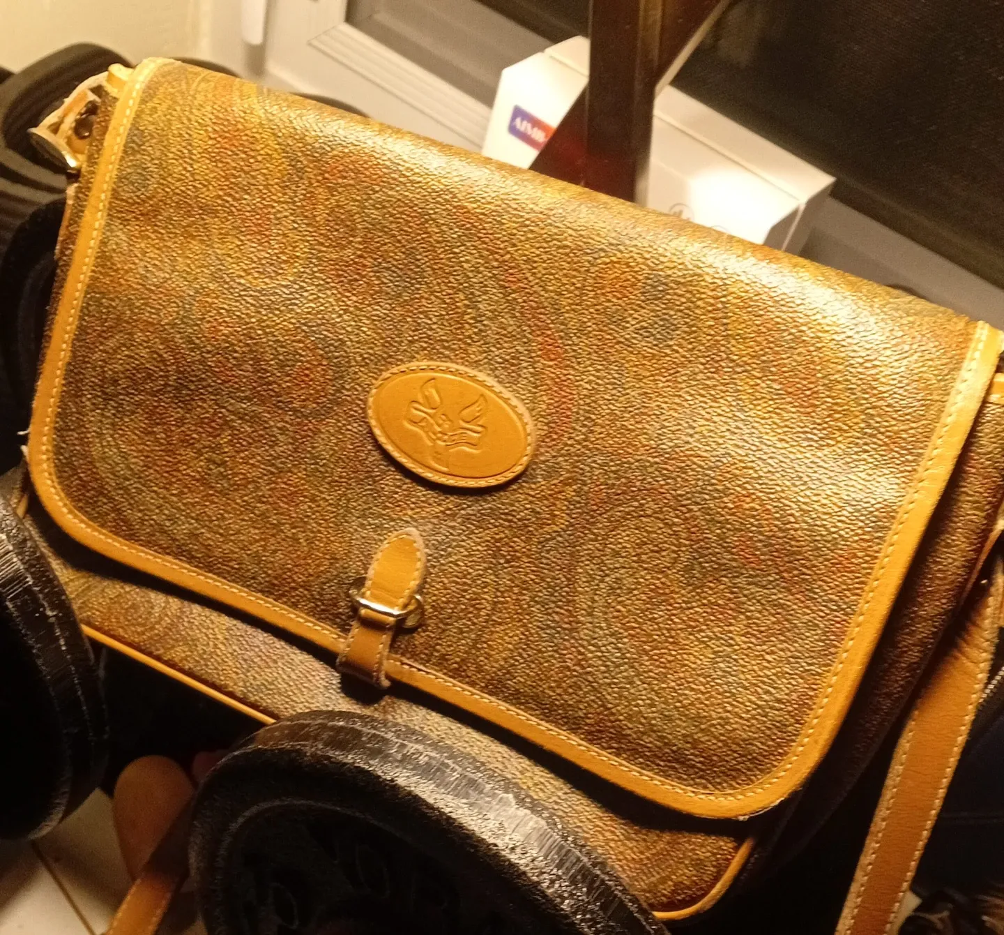 This is a stylish vintage shoulder bag with a classic paisley pattern. It features tan leather trim and a buckle closure. The bag has a durable construction suitable for everyday use.