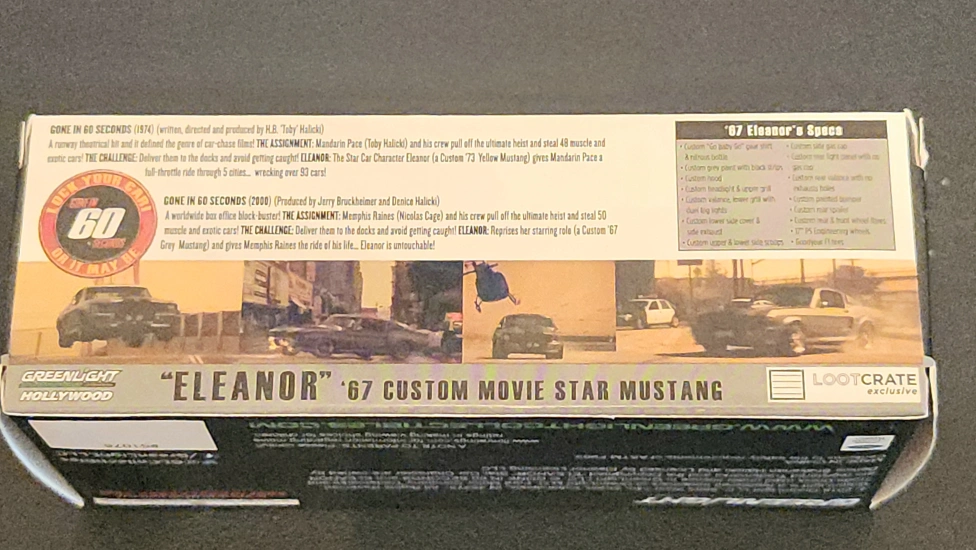 Collectible diecast model car. 'Eleanor' 67 Custom Movie Star Mustang. Gone in 60 Seconds. Officially licensed. 1:64 scale. Loot Crate exclusive.