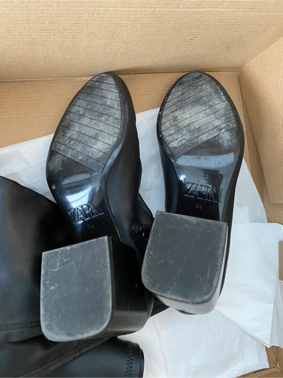 These ZARA black knee-high boots feature a block heel and pointed toe. They are a size 38. These are a versatile boot that can be worn with dresses or pants.