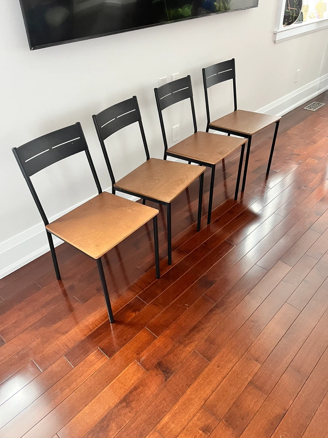 Set of four modern dining chairs. These chairs feature black metal frames and light wood-look seats and backrests. They're suitable for a dining area or as extra seating.