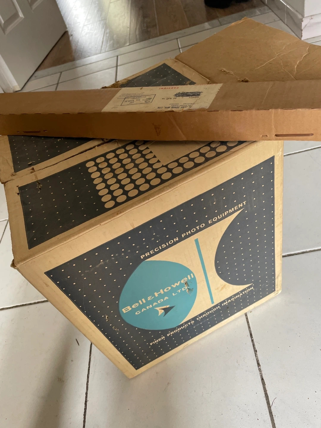 This is a vintage Bell & Howell "Precision Photo Equipment" box. It's a sturdy cardboard box with the brand's logo prominently displayed. The box has "FINER PRODUCTS THROUGH IMAGINATION" printed on it. 8 mm camera and movie screen.