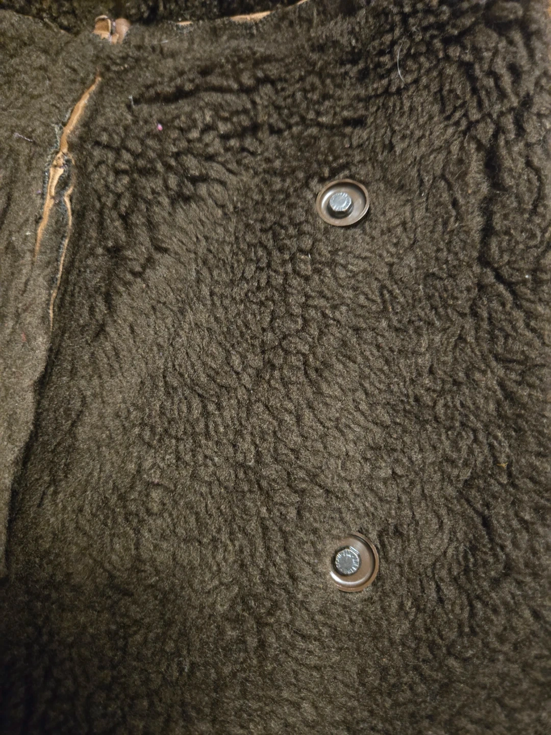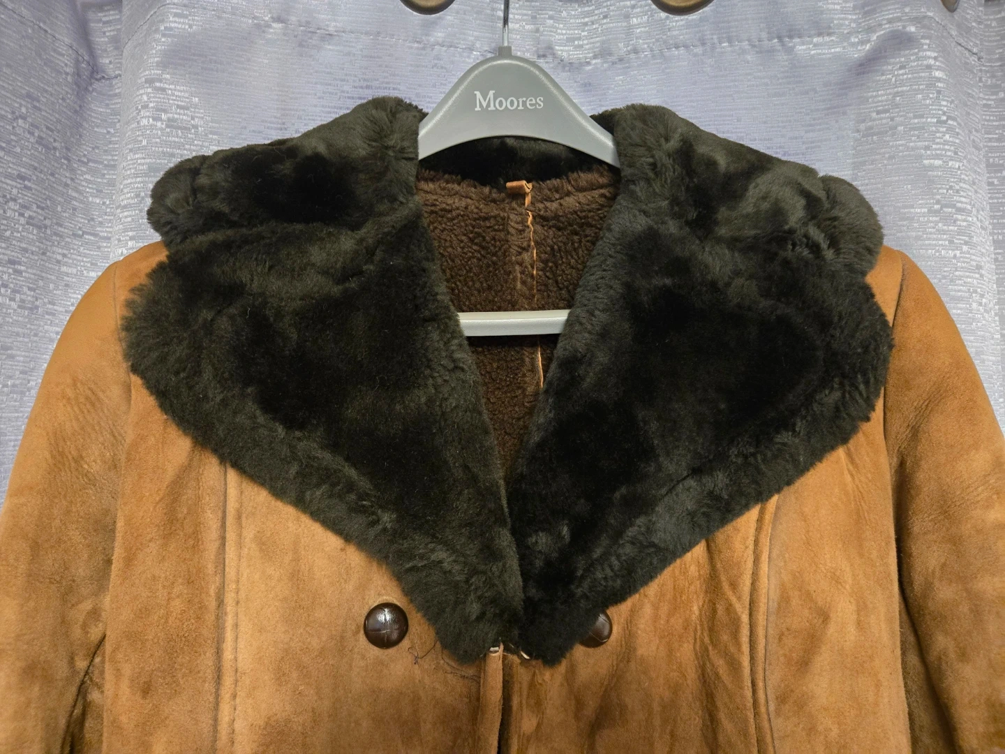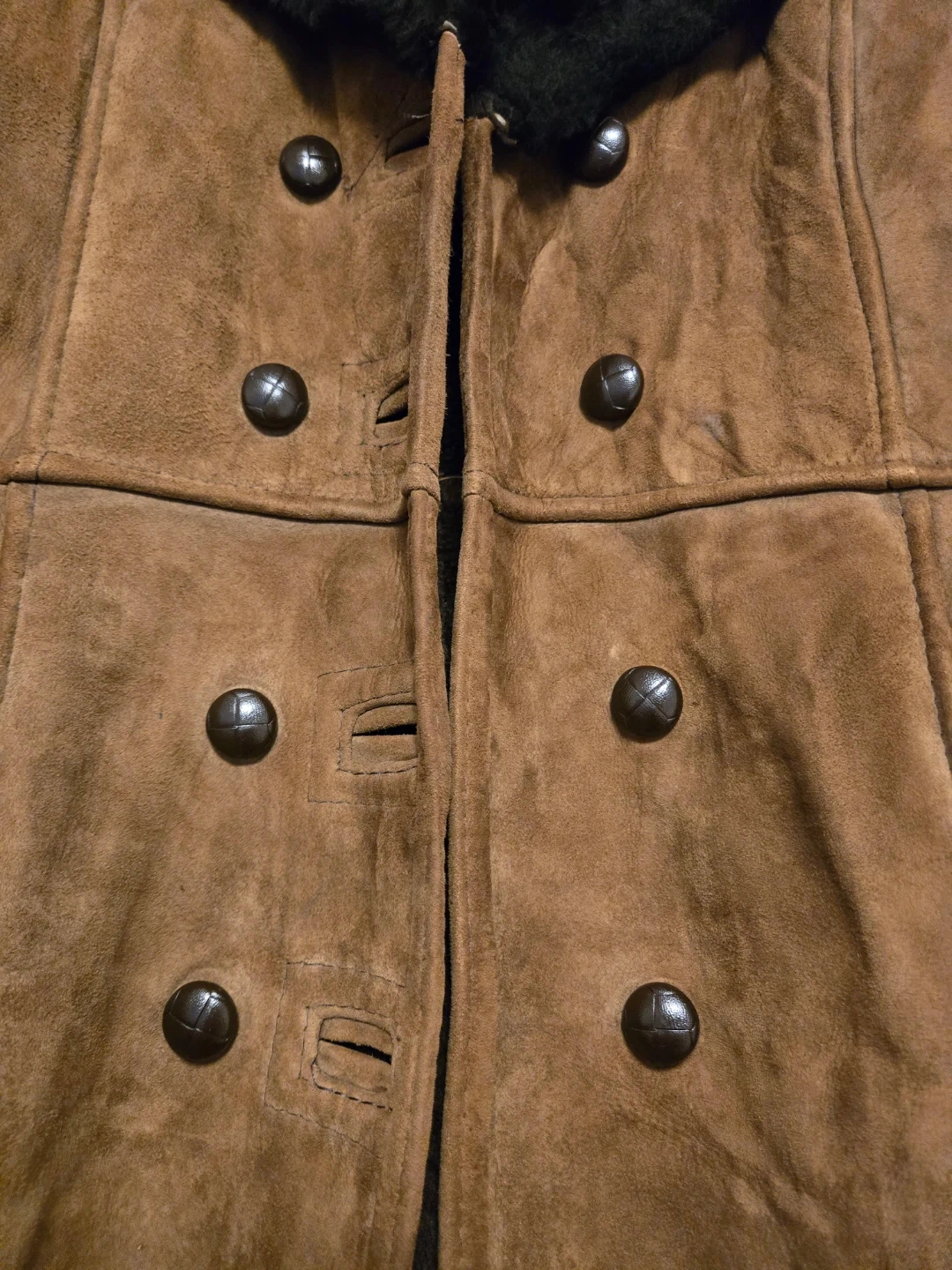 Warm double-breasted coat in brown suede. It's lined with dark shearling and features a fur collar. Includes two side pockets and dark button closures. This coat offers excellent warmth for colder weather.