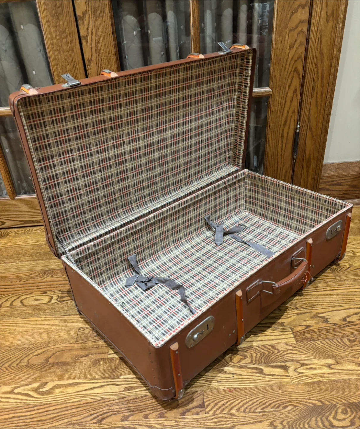 Sturdy brown hard case suitcase with a plaid interior lining. Originally from Germany, it travelled to Canada by boat, giving it authentic history and character.