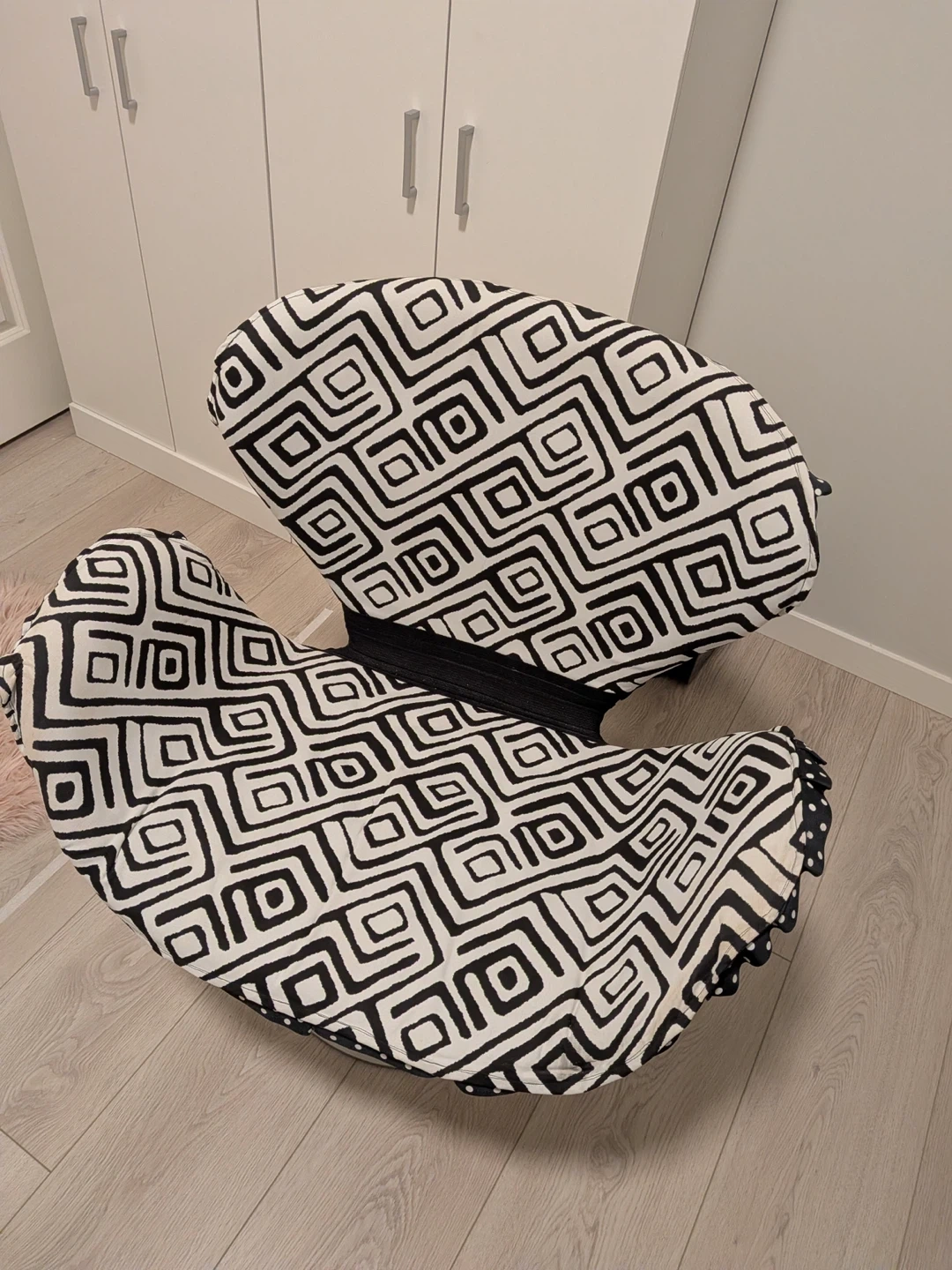 Stylish accent chair with a bold black and white geometric pattern. It features a comfortable, ergonomic design and would make a great addition to any living space. The upholstery is durable and easy to clean.