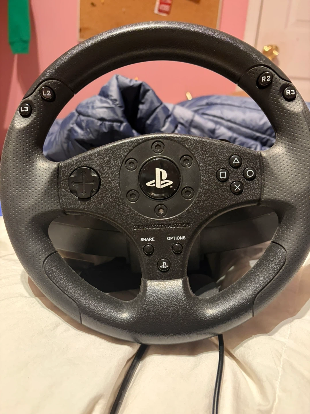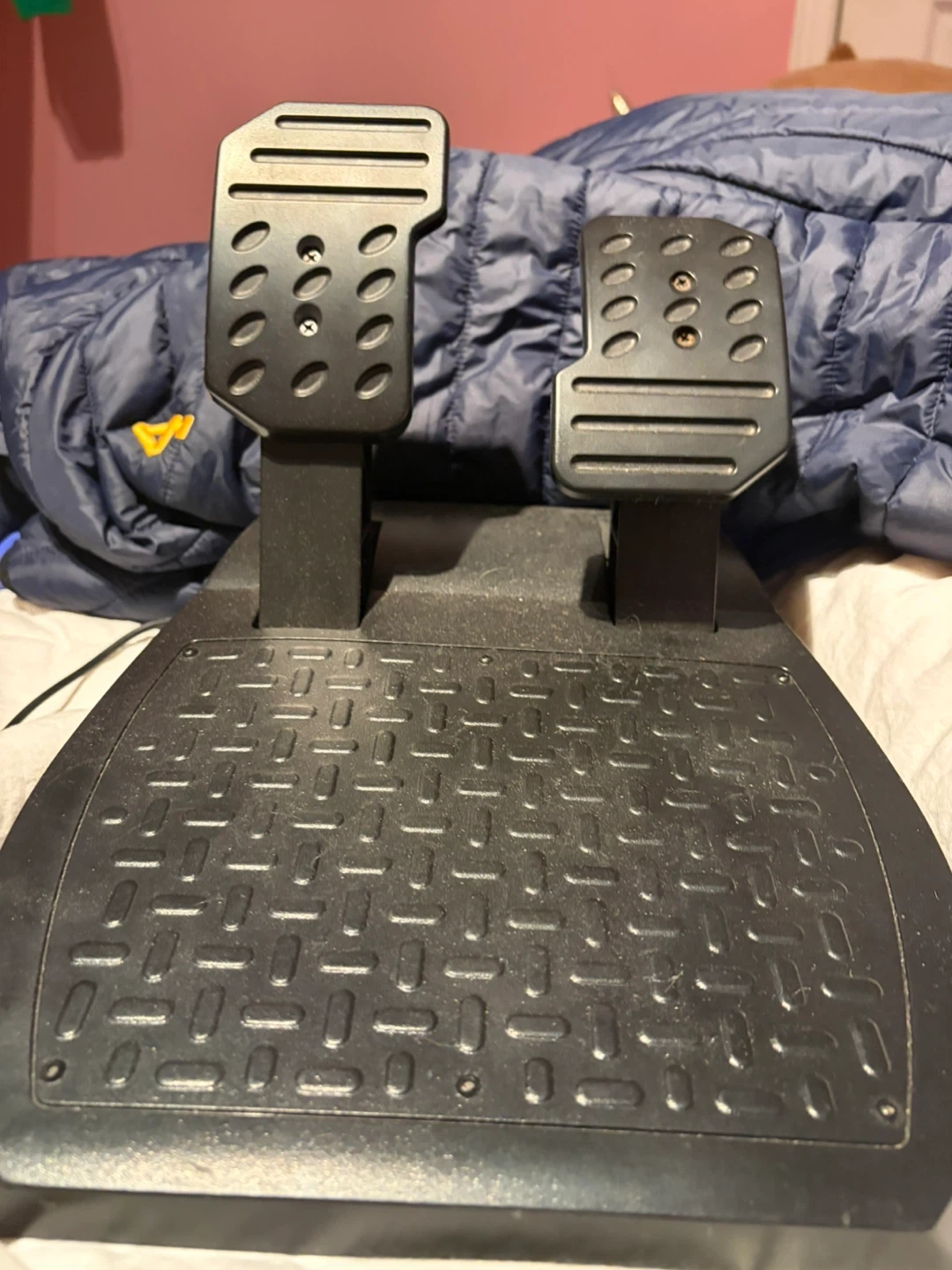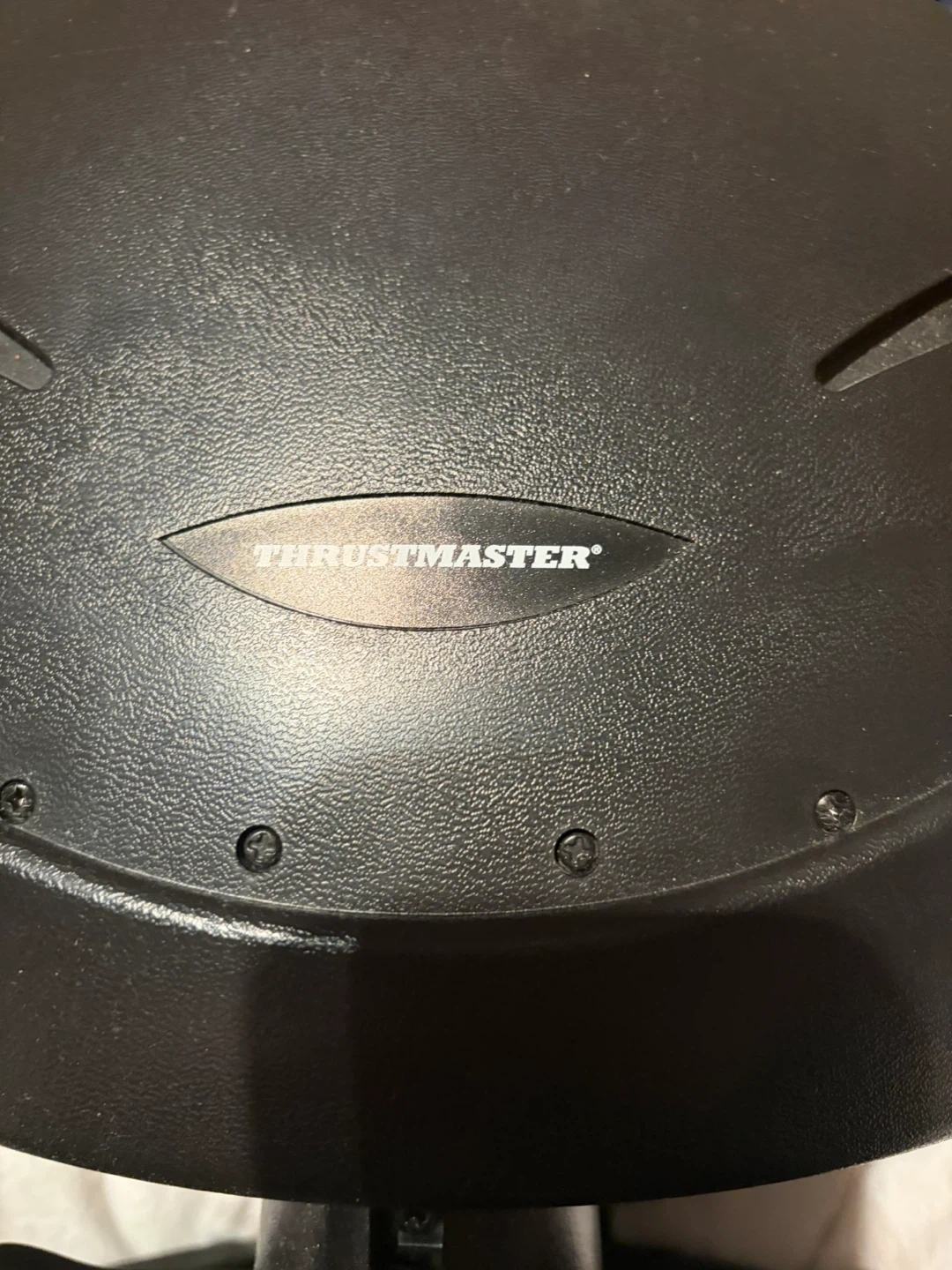 This is a Thrustmaster gaming steering wheel and pedal set. It's designed for racing games. Connects via USB.
