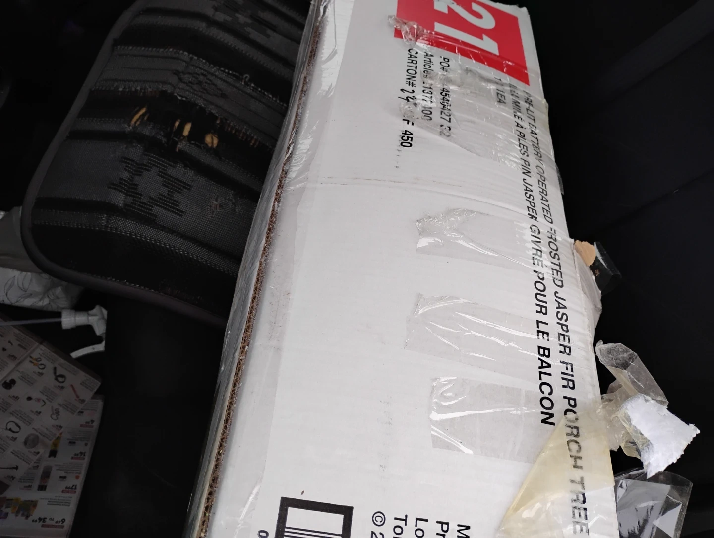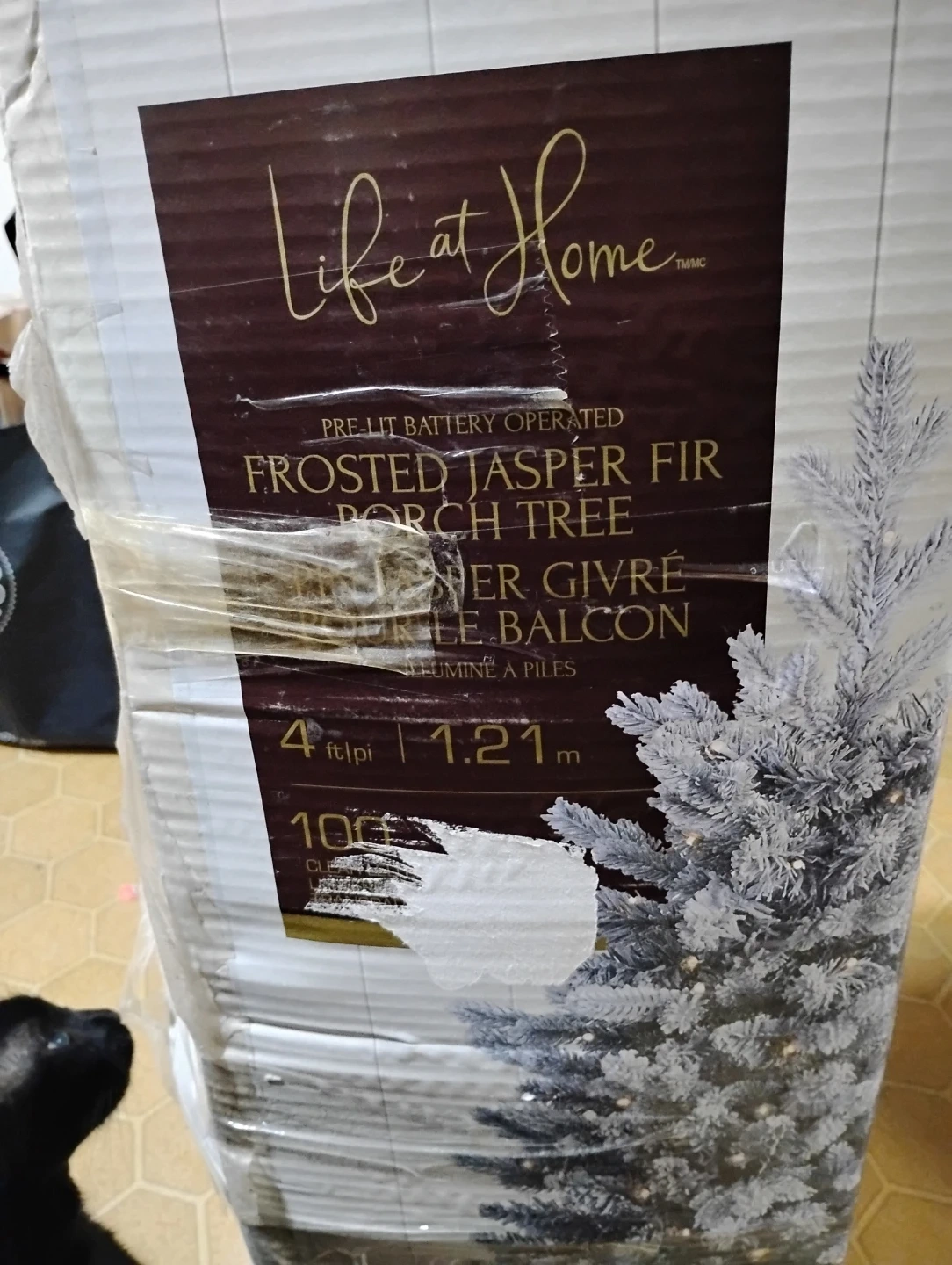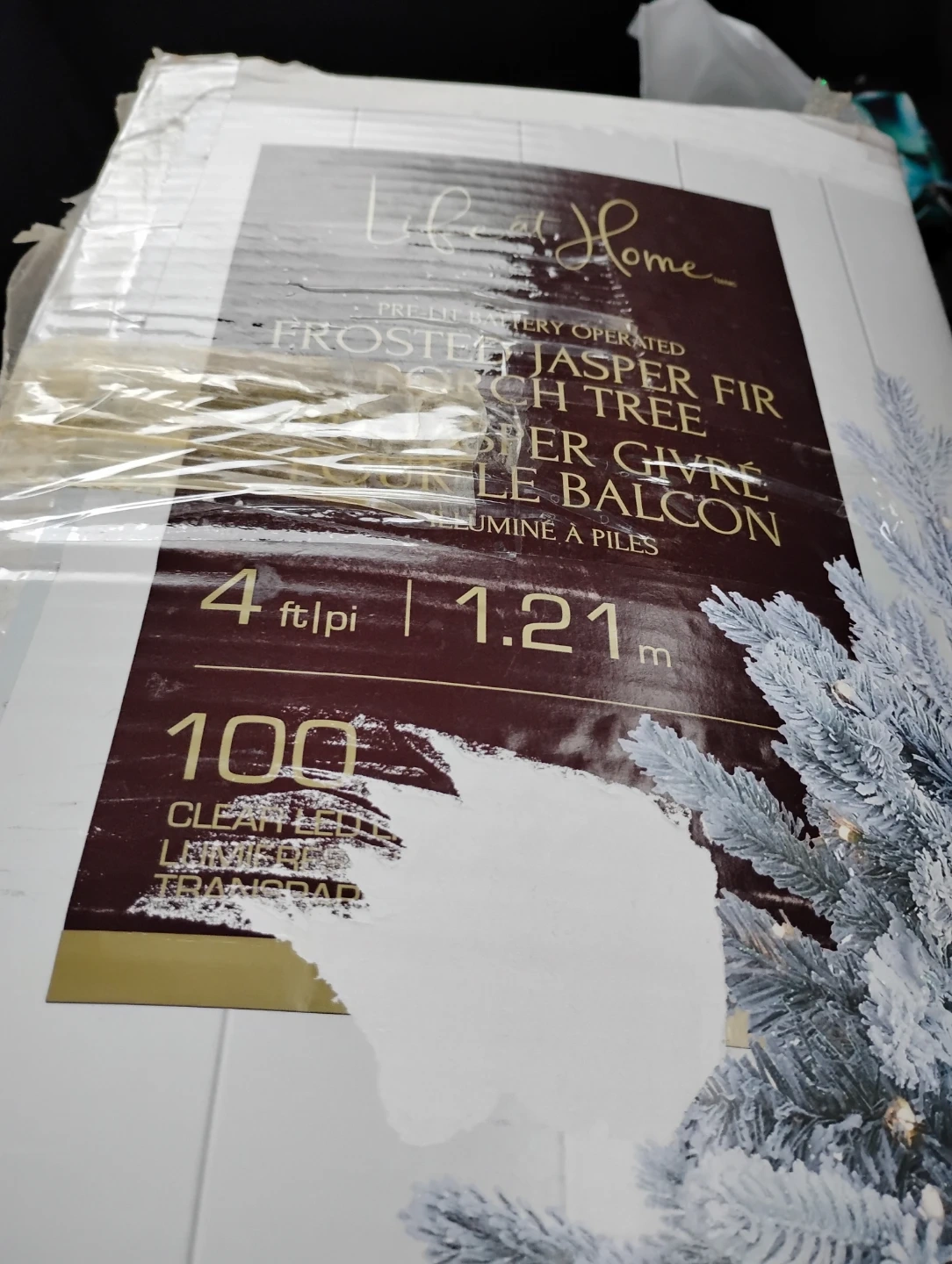 Pre-lit, battery-operated frosted jasper fir porch tree. It's 4 ft tall with 100 clear lights. Suitable for indoor or outdoor use.