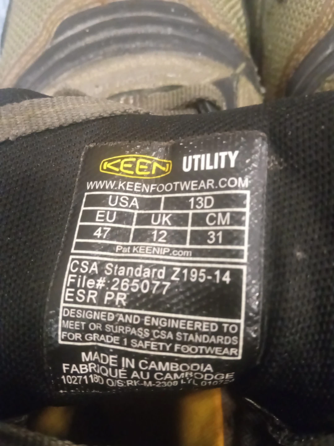 KEEN Utility work boots. Size 13D USA, 47 EU, 12 UK, 31 CM. CSA Standard Z195-14 approved for grade 1 safety footwear. Made in Cambodia.