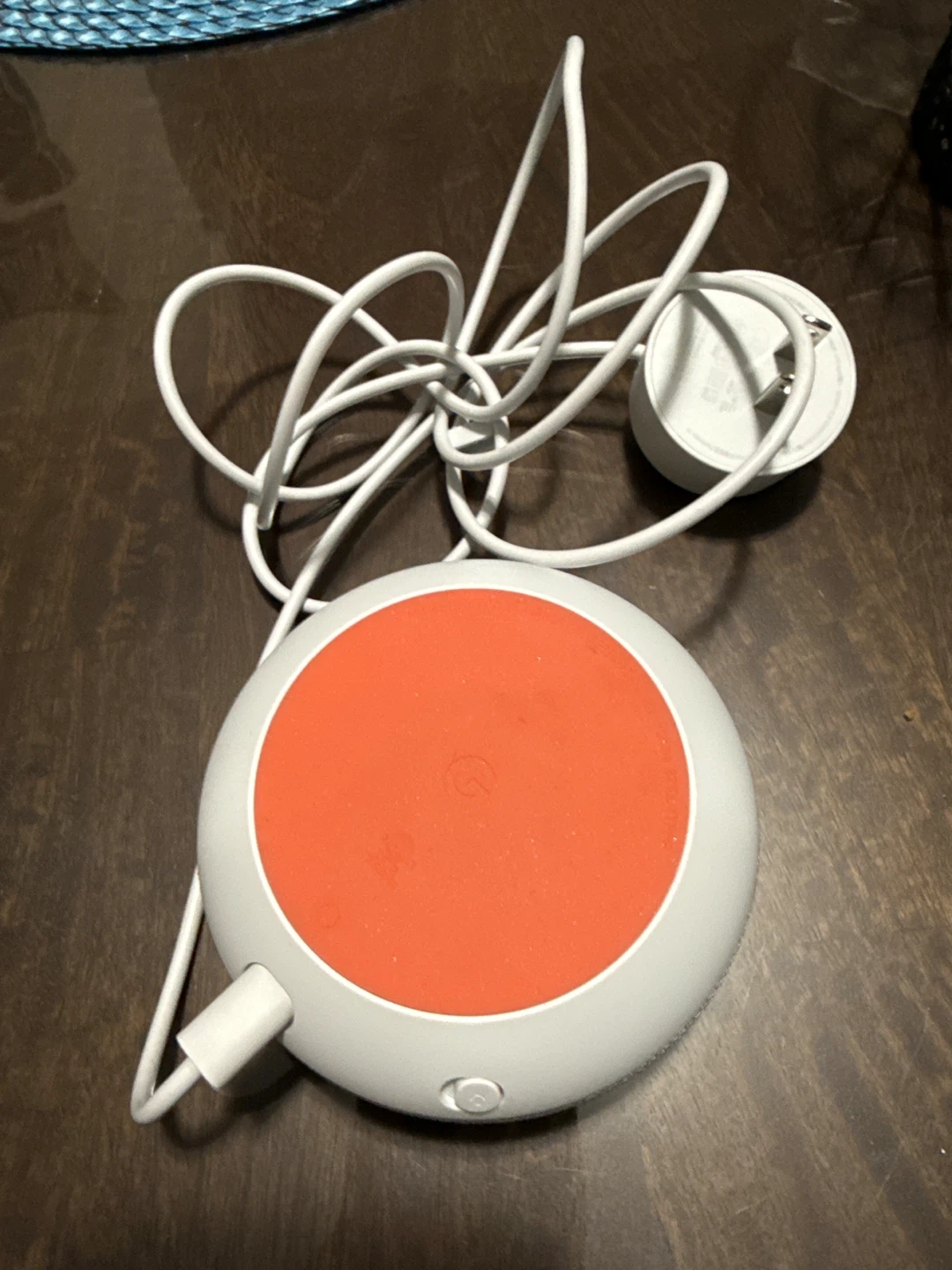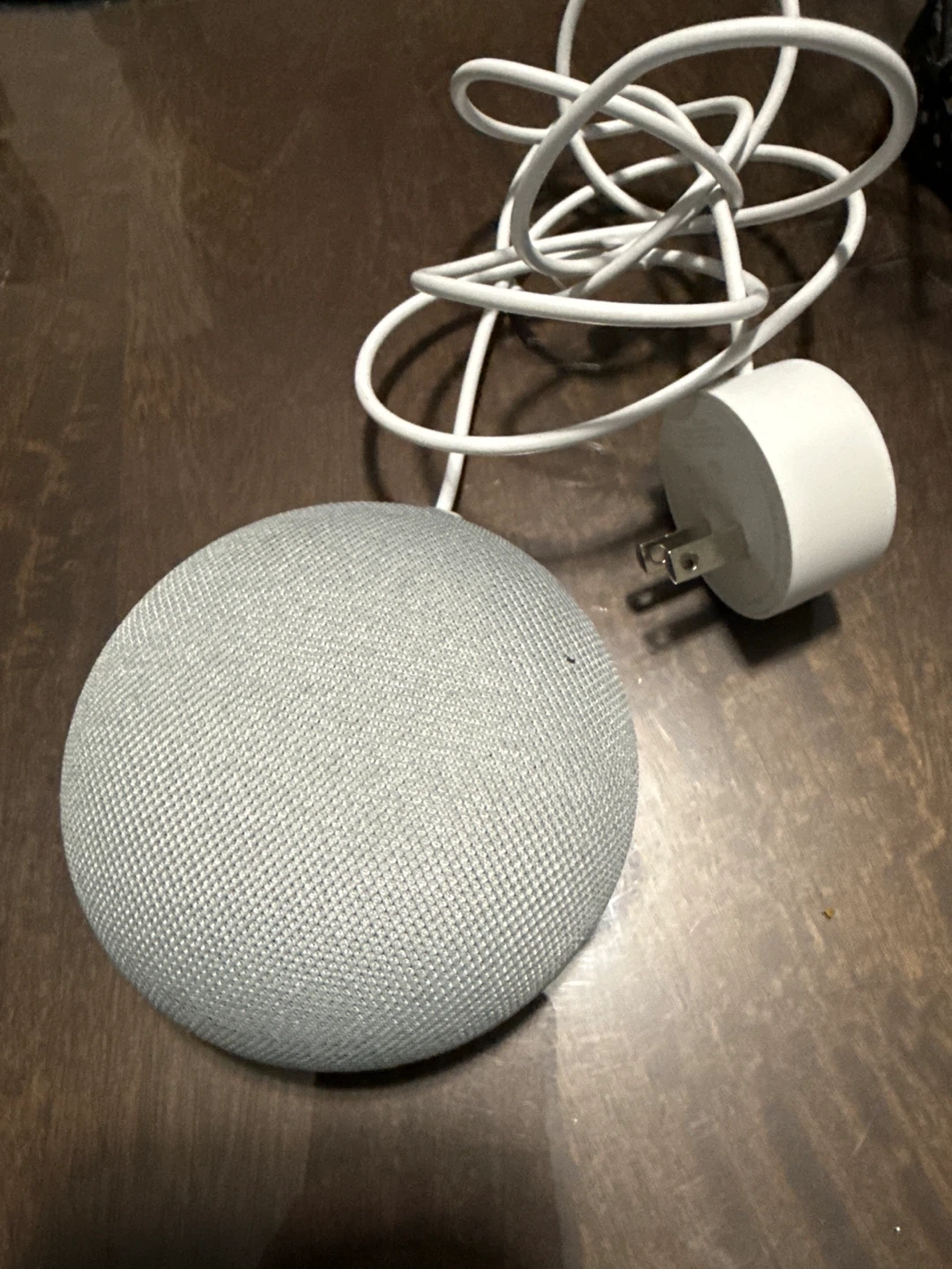 Google Nest Mini smart speaker in Chalk. Includes power adapter. Voice-controlled assistant for music and smart home control.