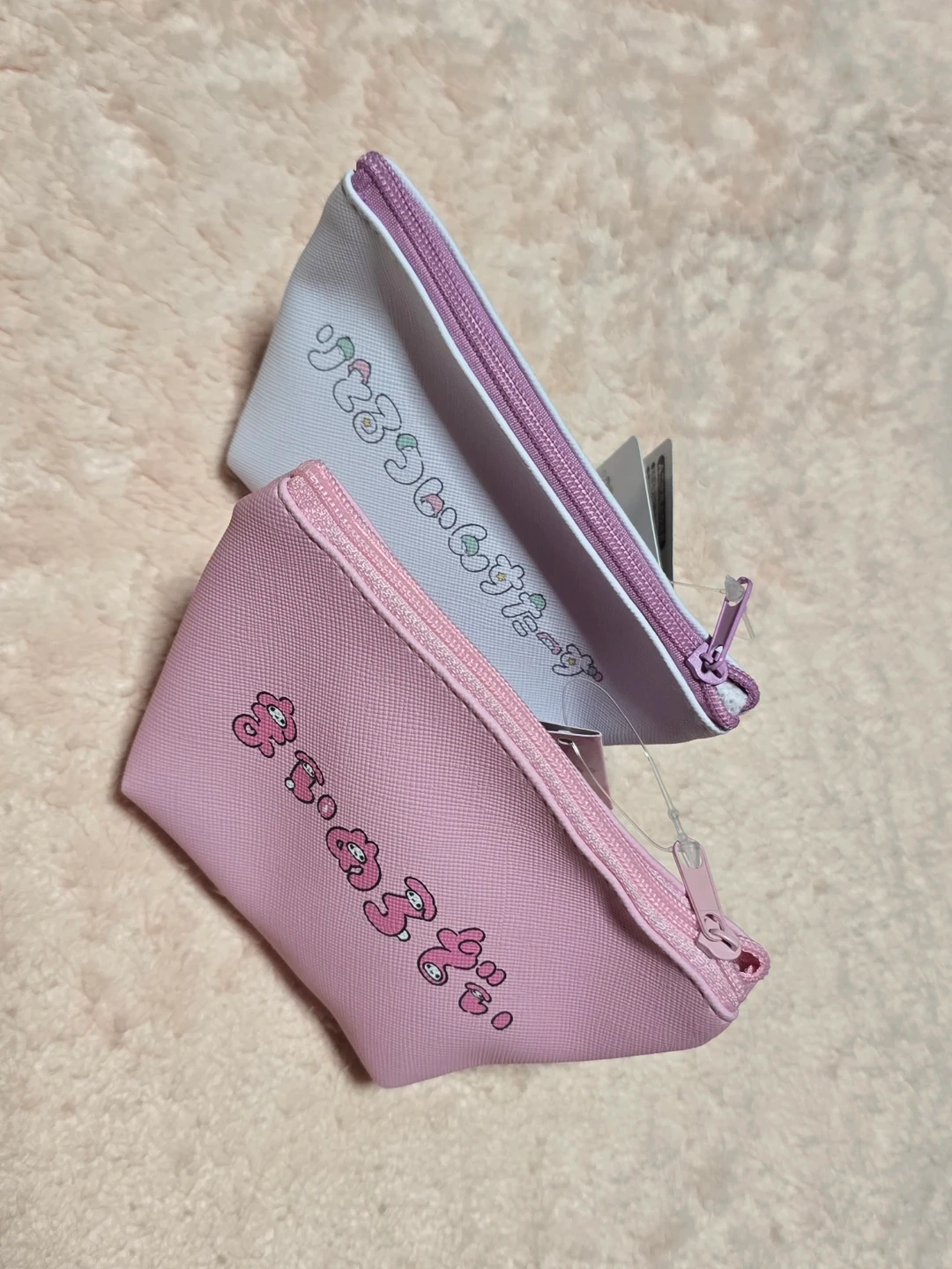 Set of two Sanrio mini pouches, one pink with My Melody and one light purple with Little Twin Stars. Perfect for organizing small items like coins, keys, or makeup. Zipper closure included.