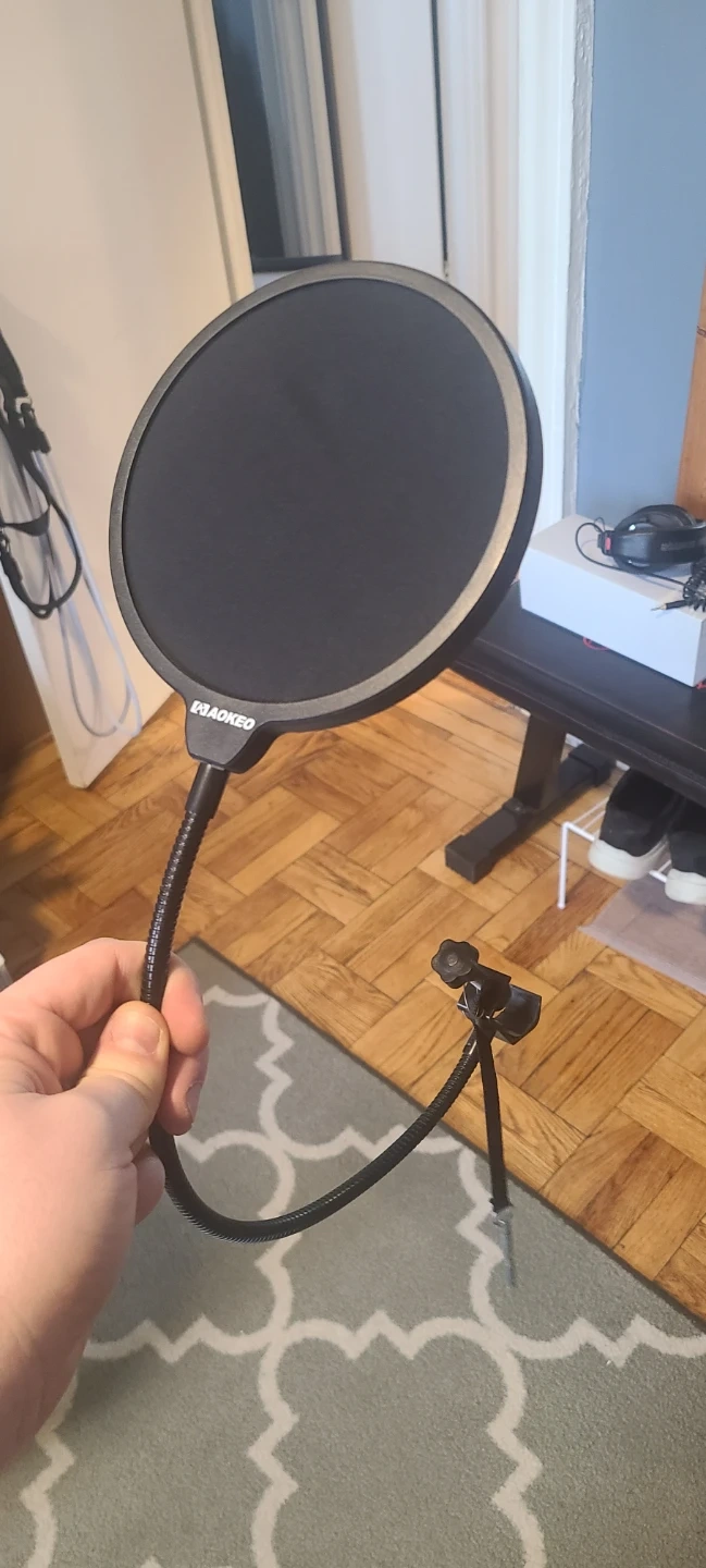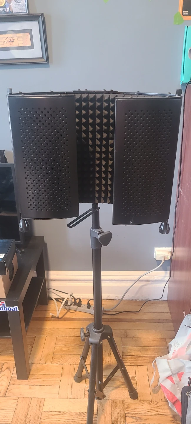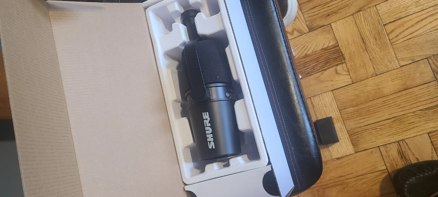 This bundle includes a Shure MV7 microphone, an Auray tripod microphone stand, and a pop filter. It's perfect for vocal recording. The mic comes in its original box with all accessories. The tripod stand is adjustable for height.