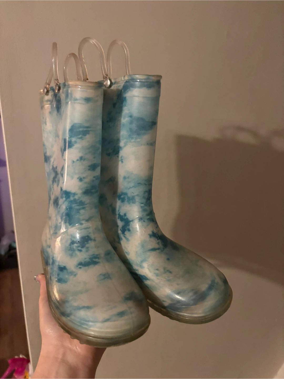 These children's rain boots feature a cool blue and white cloud pattern. They have easy-pull handles at the top girls size 4 from smoke & pet free home pick up only
