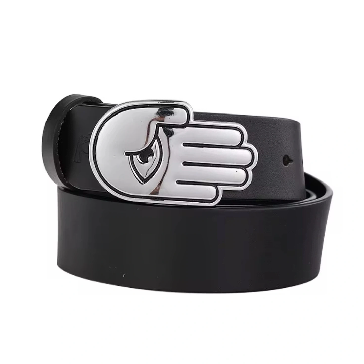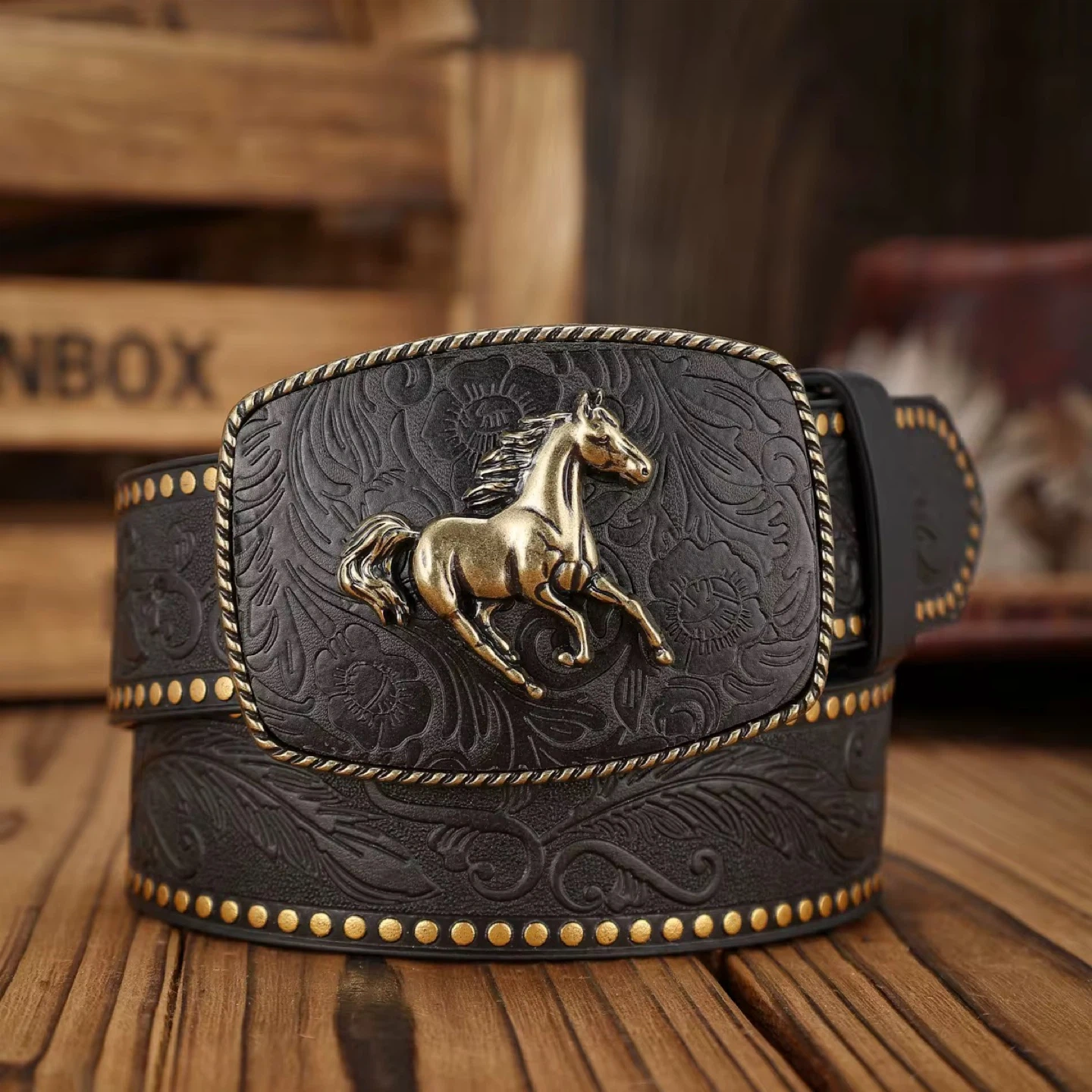 This stylish belt buckle features an embossed horse design with decorative stitching. It's made from durable alloy metal and has a classic Western look. It's perfect for adding a touch of flair to any outfit!