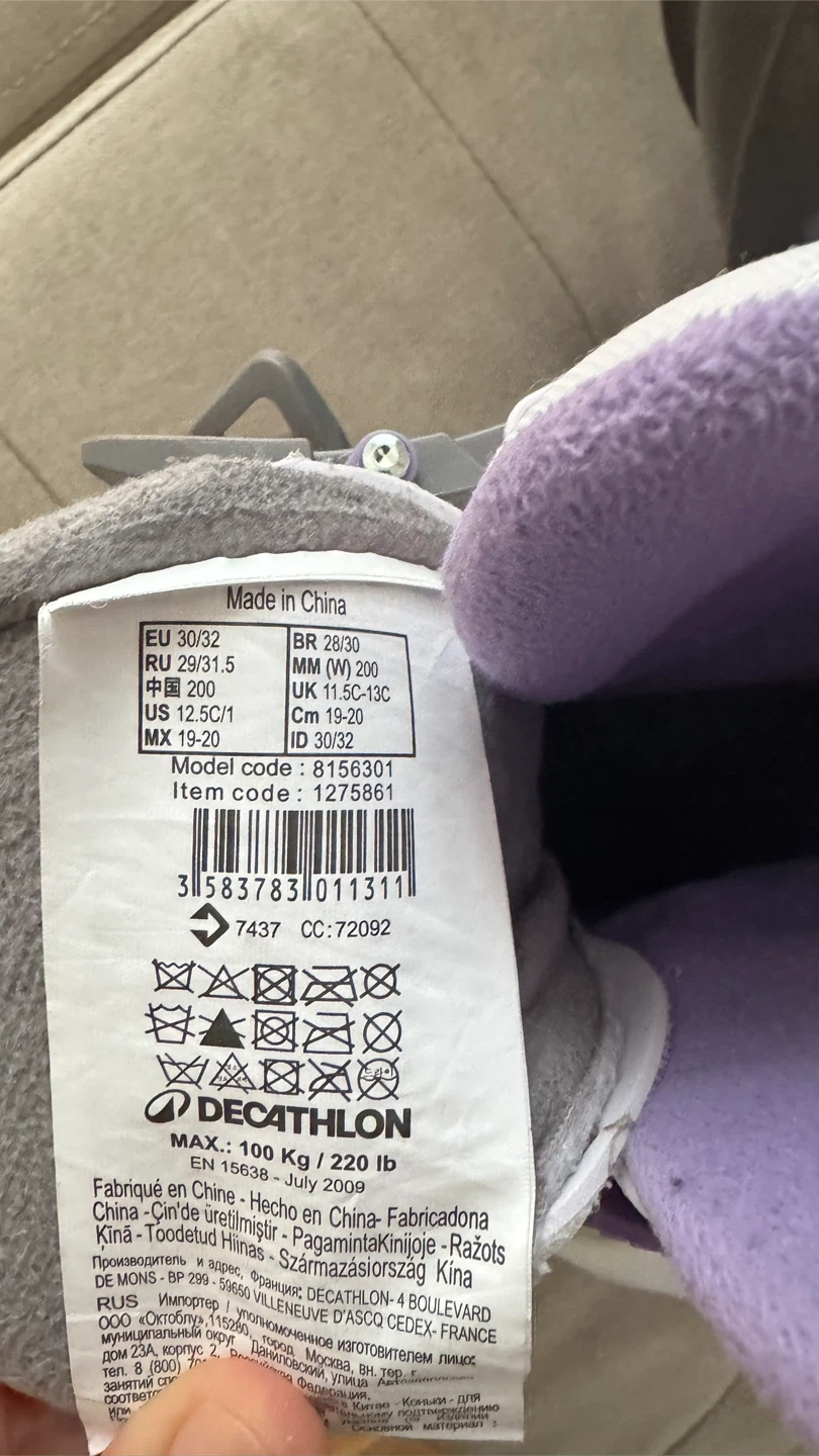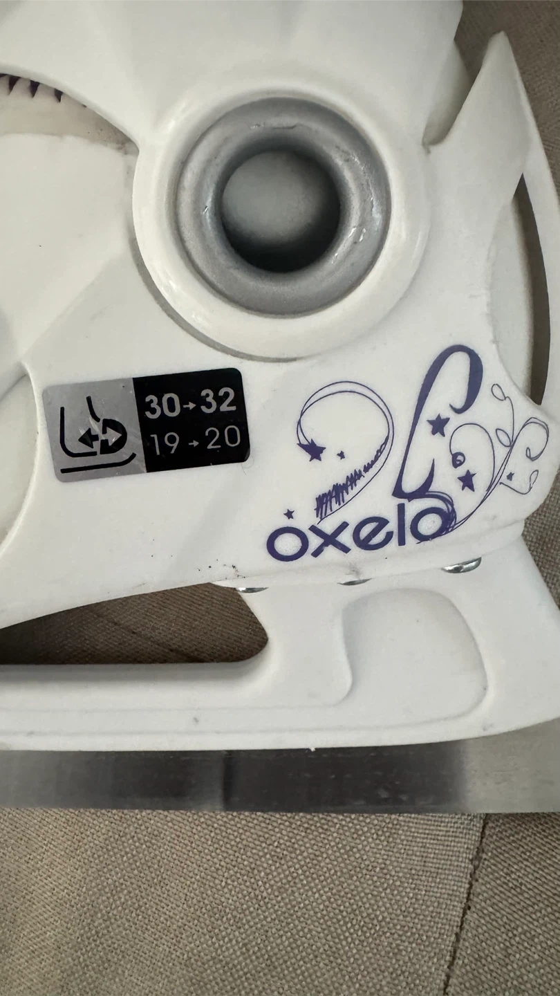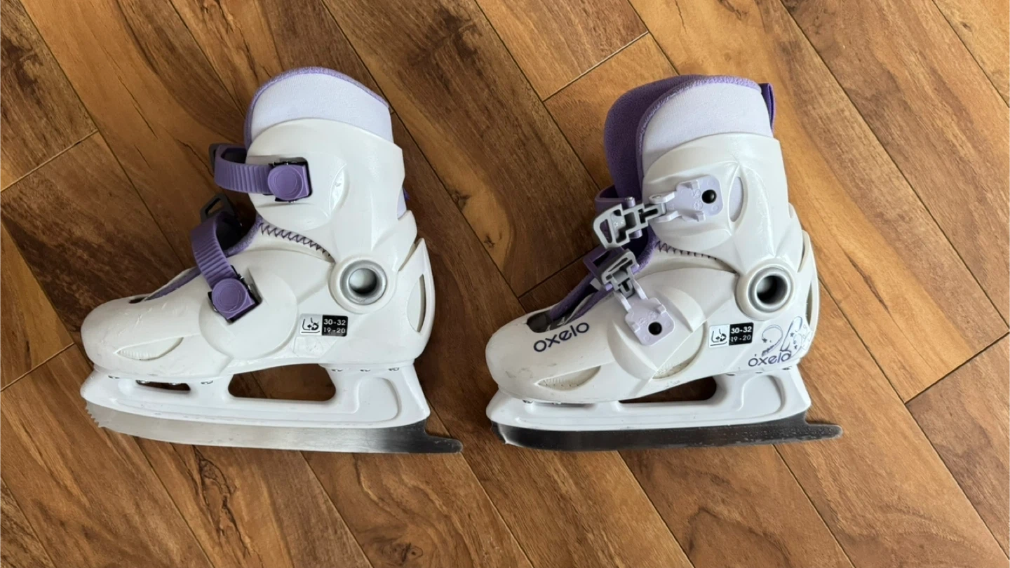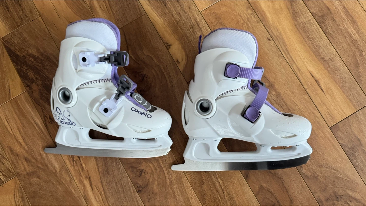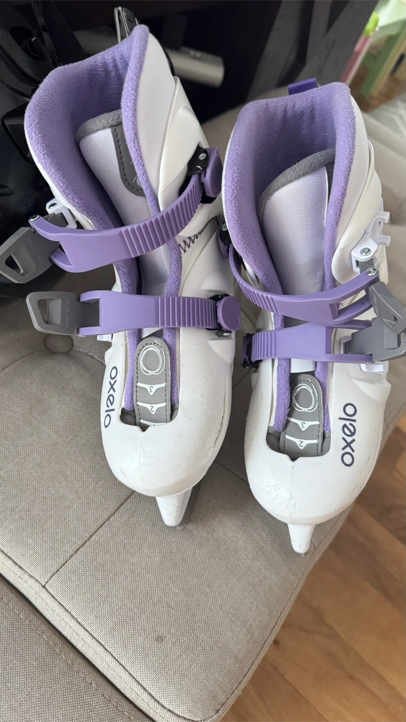 White and purple Oxelo ice skates. Adjustable size 30-32. Comes with straps and buckles for a secure fit. Great for beginner skaters learning to glide on the ice!