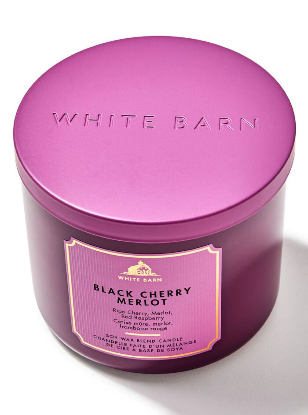 This is a White Barn Black Cherry Merlot 3-wick candle. It's a soy wax blend.