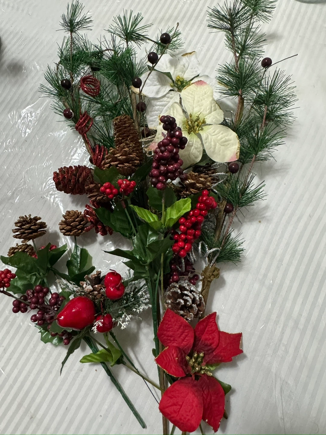 Festive arrangement with pine sprigs, pinecones, red berries, and poinsettias. It's great for adding a touch of holiday cheer to your home. A lovely way to decorate for the Christmas season!
