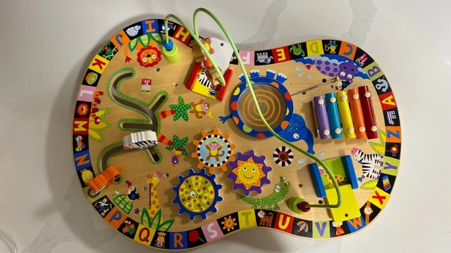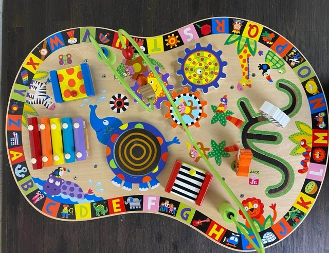 Colorful wooden activity board from ALEX Jr. Lots of fun stuff for little ones to explore. Has a xylophone, spinning gears, bead maze, and animal alphabet border. Good for motor skills and keeping babies/toddlers busy. About 64 cm wide and 28 cm tall. Note: I made the base from timber for better stability.