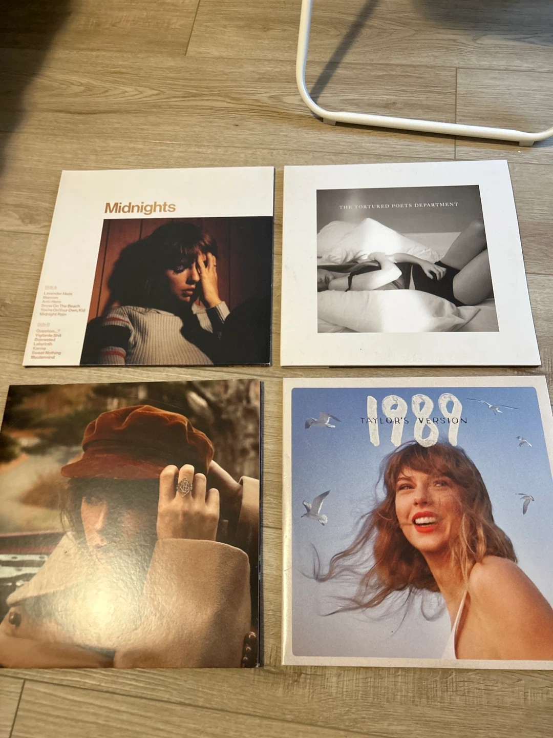 Collection of Taylor Swift vinyl records featuring 'Midnights', 'The Tortured Poets Department', and '1989 Taylor's Version'. These are LP records. "1989 Taylor's Version" is a popular re-recorded album. A must-have for any Swiftie!