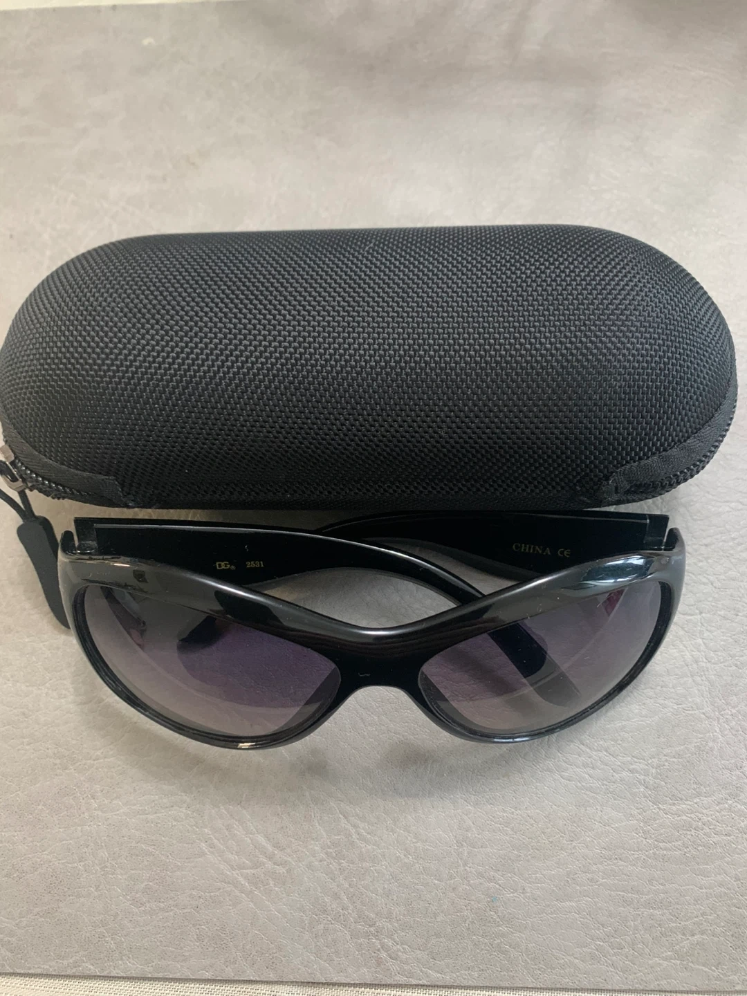 Black sunglasses with a hard protective case. Includes model number 2531. Made in China. Perfect for sunny days!