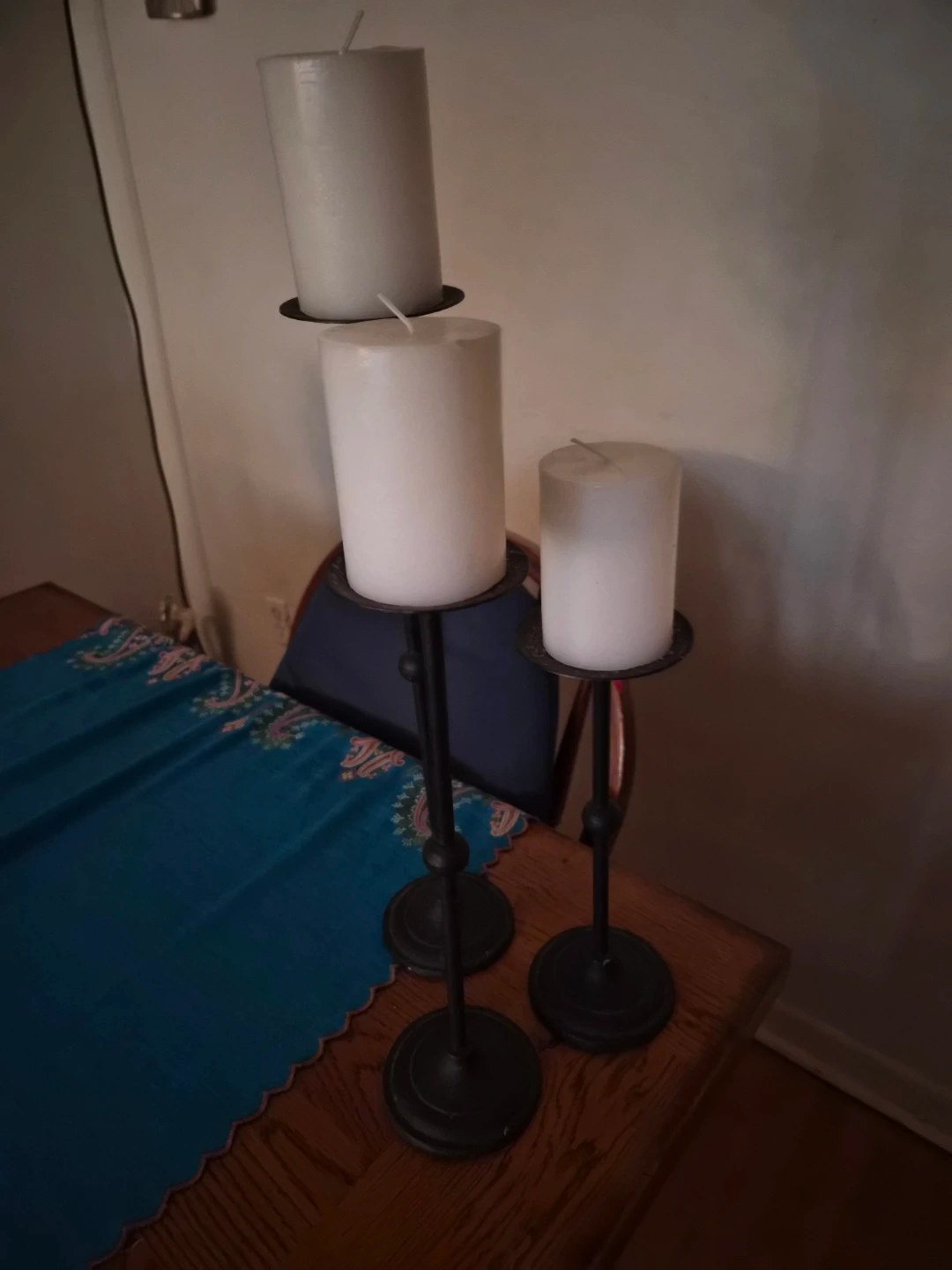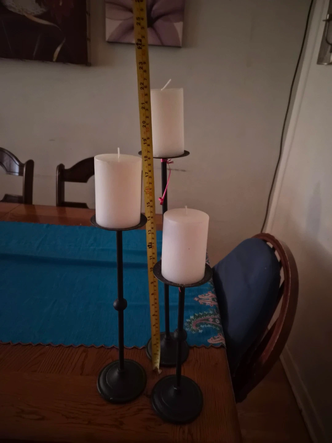 Candlesticks are black metal with a classic design. They hold pillar candles and come in three different heights. Perfect for adding ambiance to any room!
