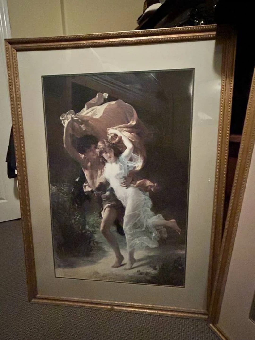 Framed print of a painting by P.A. Cot. “THE STORM” Very nice antique gold frame . There is another matching framed print for sale on Karrot i have posted also .