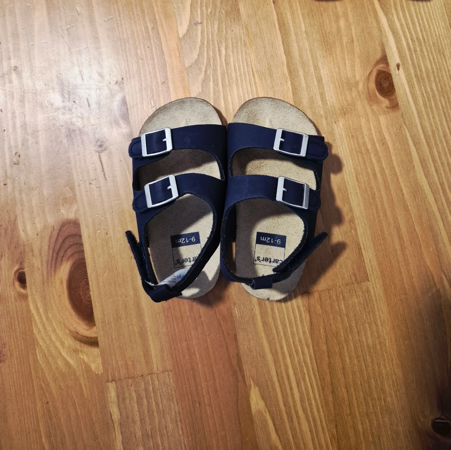 These are navy blue Carter's sandals with buckle and velcro closures. They're a size 9-12 months. The footbed appears to be cork.
